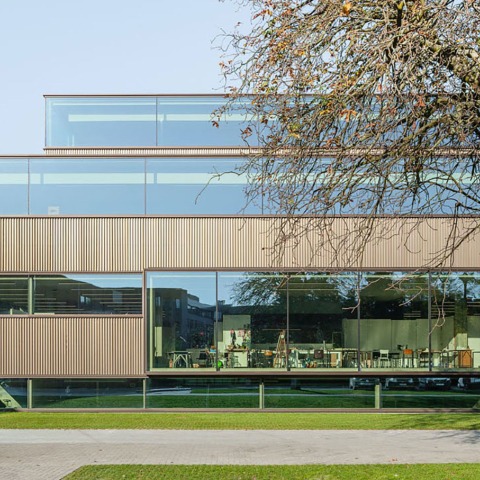 In general, the aim was to reduce the necessary structure to a minimum. In consultation with the engineers of BAS Leuven, a structural system was developed with a minimum of columns, loadbearing facades and cantilevering walls in the corners to avoid the need for corner columns. The top roof was executed as a "hanging roof" with prestressed roof beams to avoid further column use. The ventilation system of the building was based on the new BaOpt principle. By doing so horizontal air ducts were avoided resulting in a visually nearly "installation-free" building.