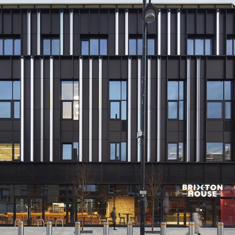 Brixton House sits within the surrounding streetscape with a façade that relates to the adjacent industrial architecture of the Brixton markets and railway, and the early street lighting of nearby Electric Avenue. On upper levels, black anodised fins give depth and modulation to the facade and provide a constantly changing appearance when moving around the building; a pattern that also references the vertical folds of the theatre curtains within. Fins on the façade hide coloured LED lighting that is programmable to allow a variety of subtle lighting effects, patterns and colourways.