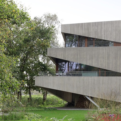 Each storey is set back in relation to the previous one and has been superimposed at a slightly shifted angle, with the intention of creating privacy and a sense of security for the residents. This fan-like movement inward also creates a playful effect that counters the monolithic appearance of the nine-metre-high building. At the same time, the fan shape is intended to cast as little shadow as possible on the neighbours. The breaches in the concrete walls in turn create exciting openings to the garden and the water. While the concrete construction is no less imposing than the ships that slowly pass by on the canal, the openings give the whole a human scale.