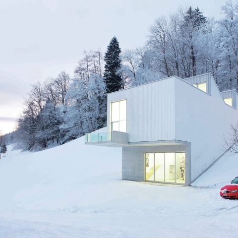 The studio is located on a steep terrain that is almost always covered with snow, tucked into the hillside towards the north and opening up to the south to harbor an open-plan space for the artist´s workshop, and a lower-ground floor for storage. A large window brings the landscape into the atelier, while two skylights guarantee zenithal illumination. The main volume and skylights are cut of the hillside defining a triangle, giving the building a characteristic image that is highlighted with its white industrial finishes, in tune with the snow-covered roofs and fields around it.
