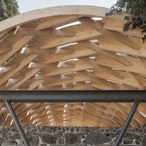 The roof was built by the local workshop ArtWorks using the Zollinger Lamella system, developed in 1920s Germany by engineer Friedrich Zollinger. This method consists of a rhomboidal matrix of planar timber pieces, joined together with bolts and repeated modularly. The result is a lightweight, self-supporting structure that, at the time, became popular in Northern Europe and Latin America for spanning large distances with minimal material, applied in hangars, warehouses, and sheds.
