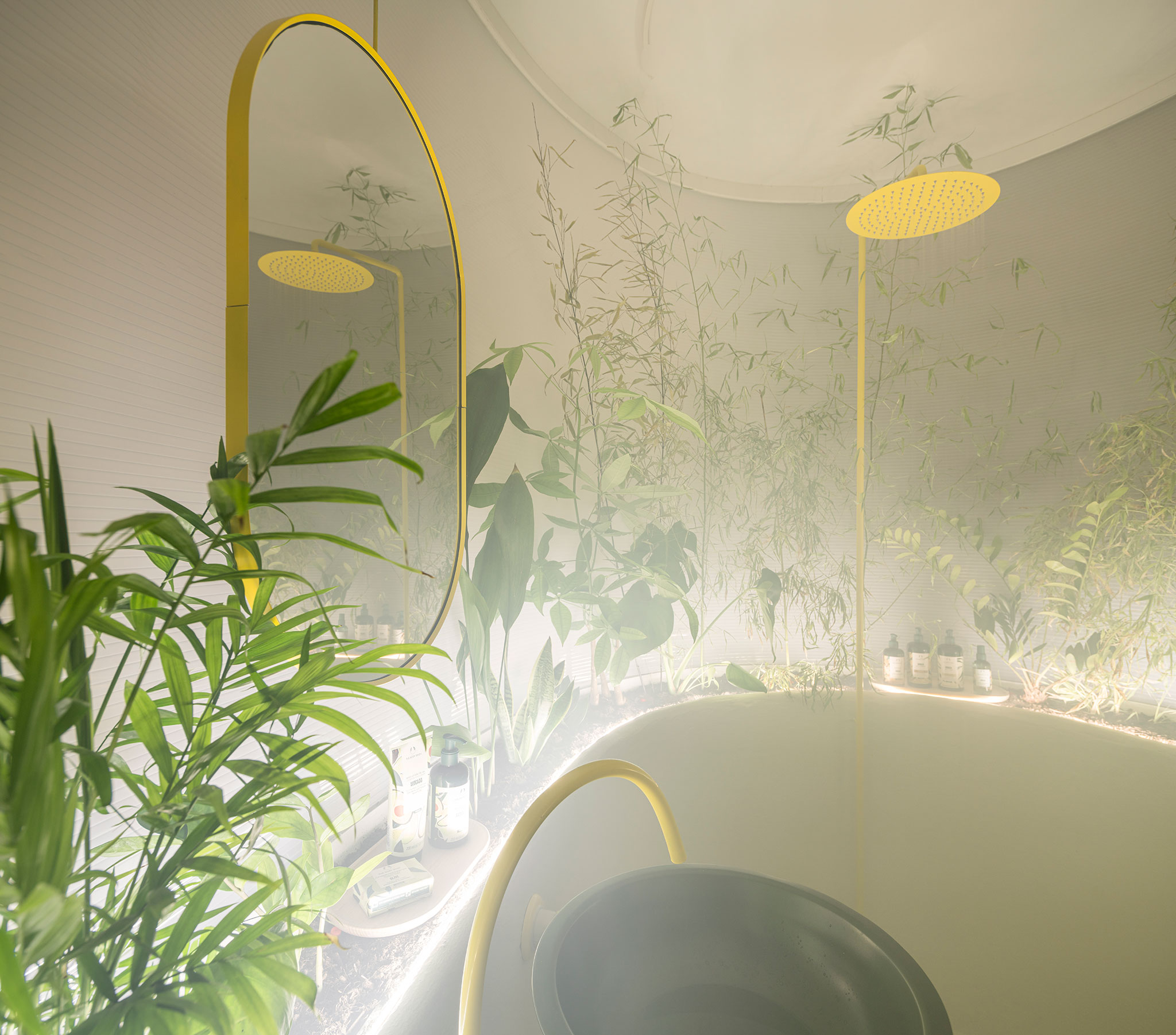 The atmospheric experiment conceived by Corrigan Arquitectos unfolds within an open-plan space, organized in a fluid and organic manner. Areas for rest and contemplation are defined by movable panels, while a translucent central oval houses the most intimate zone, providing privacy and allowing natural light to enter.