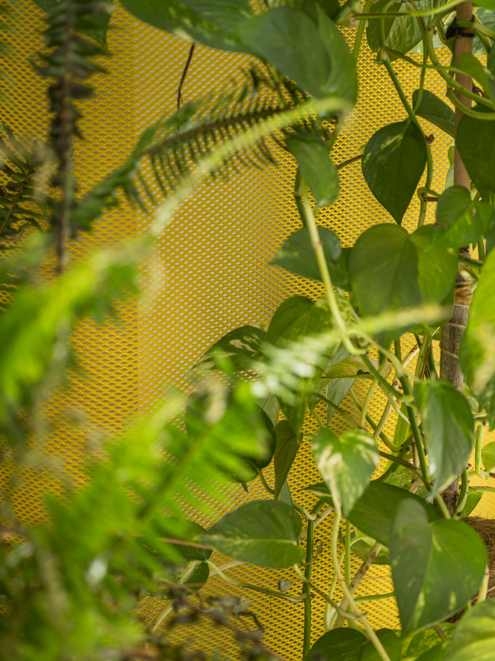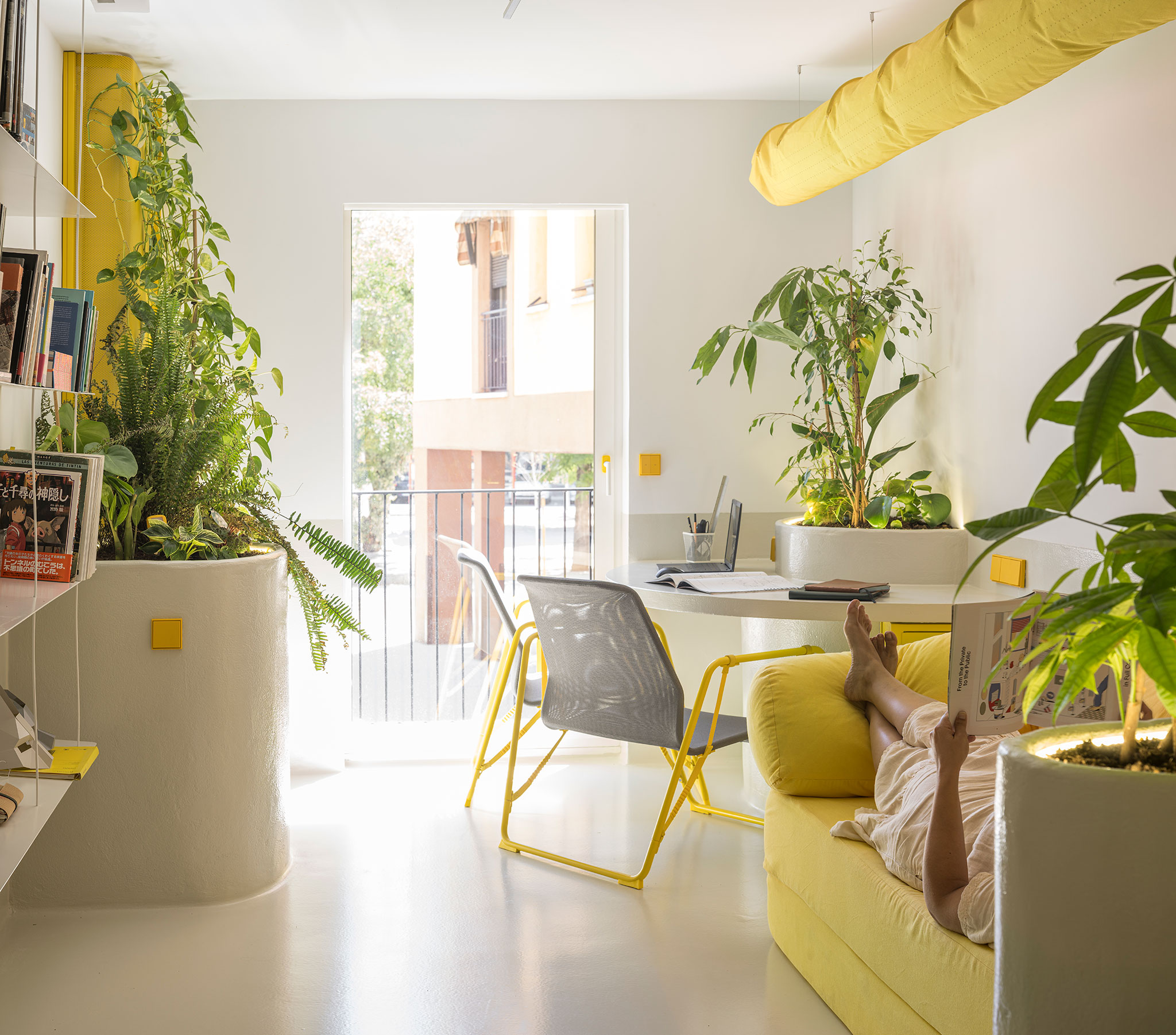 Based on these premises, the space is modulated by a series of lightweight and porous materials: metal mesh, which allows for delimitation without obstruction; translucent polycarbonate, which filters light while maintaining privacy; textile curtains, which expand or contract visual privacy; and natural vegetation that does not decorate, but rather structures, filters, and regulates.