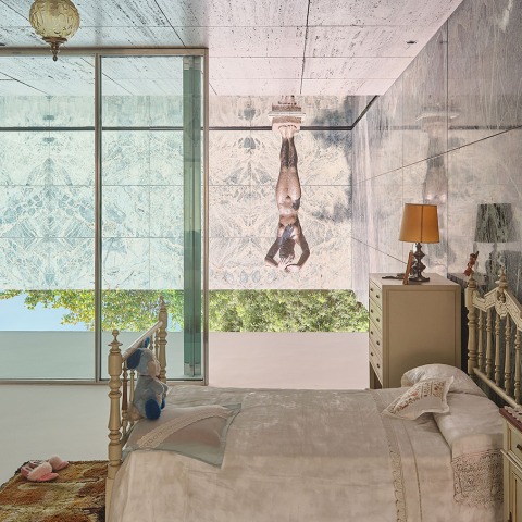 Bayona established a vivid contrast between everyday objects and the material and geometric abstraction that defines the Pavilion. The intervention constructs a composition that disrupts the visual perception established by gravity, symbolically altering the world above and below, the sky and the earth, the white floor and the travertine ceiling, the water as a porch and the clouds as a carpet, the full and the empty. In short, a temporal alteration that modifies the Pavilion's capacity for habitation.