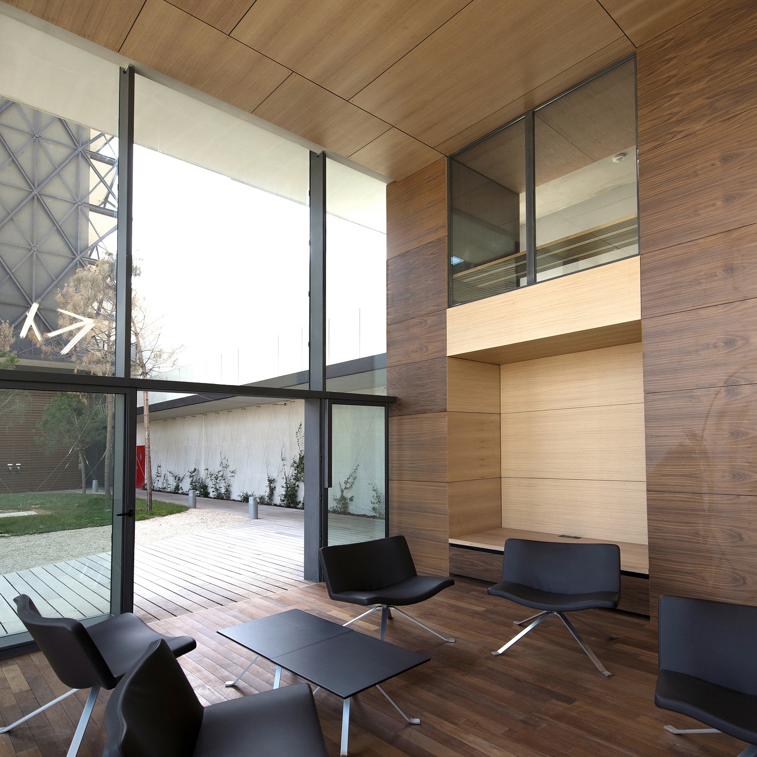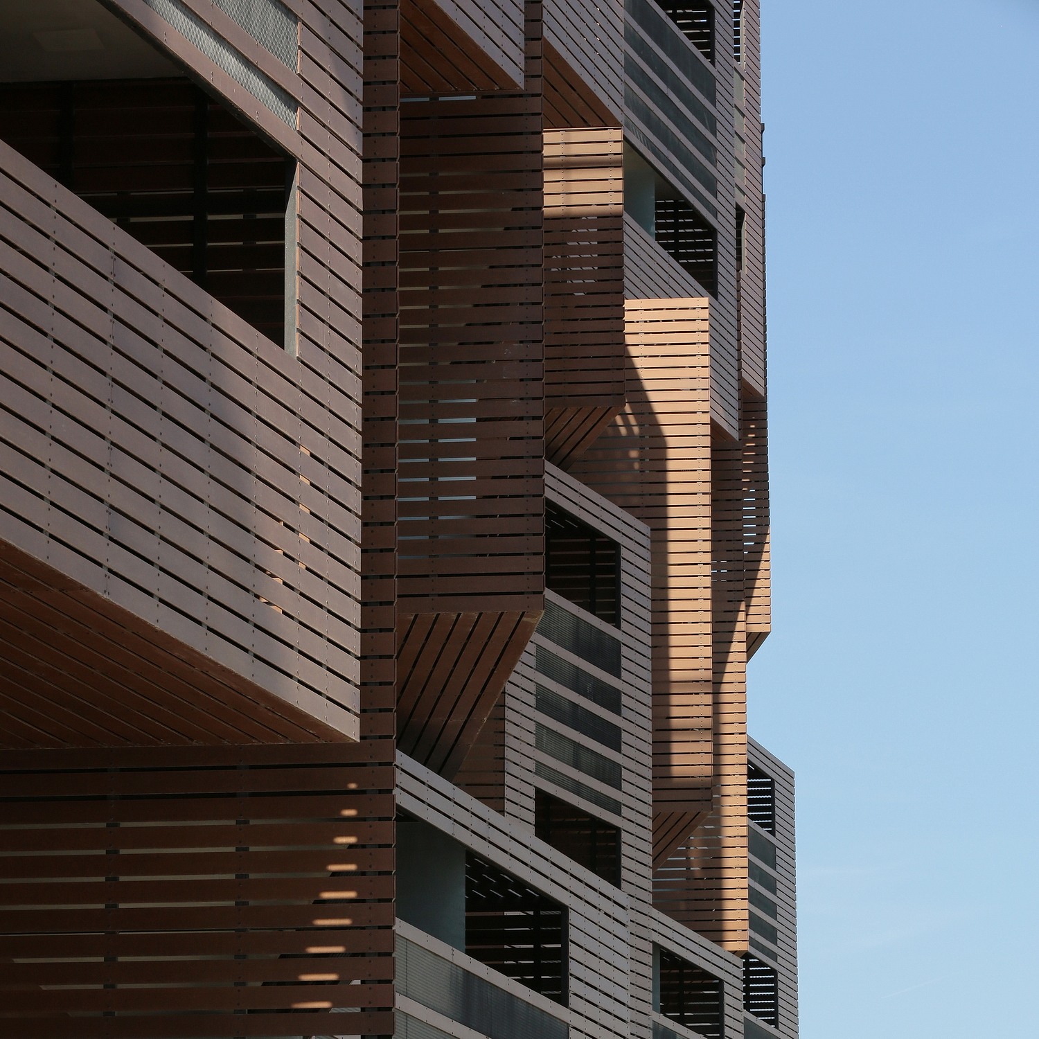 Narrow length of the plot with 10 floors gives to site a significant presence. Each volume contains two different faces according to the function and program: