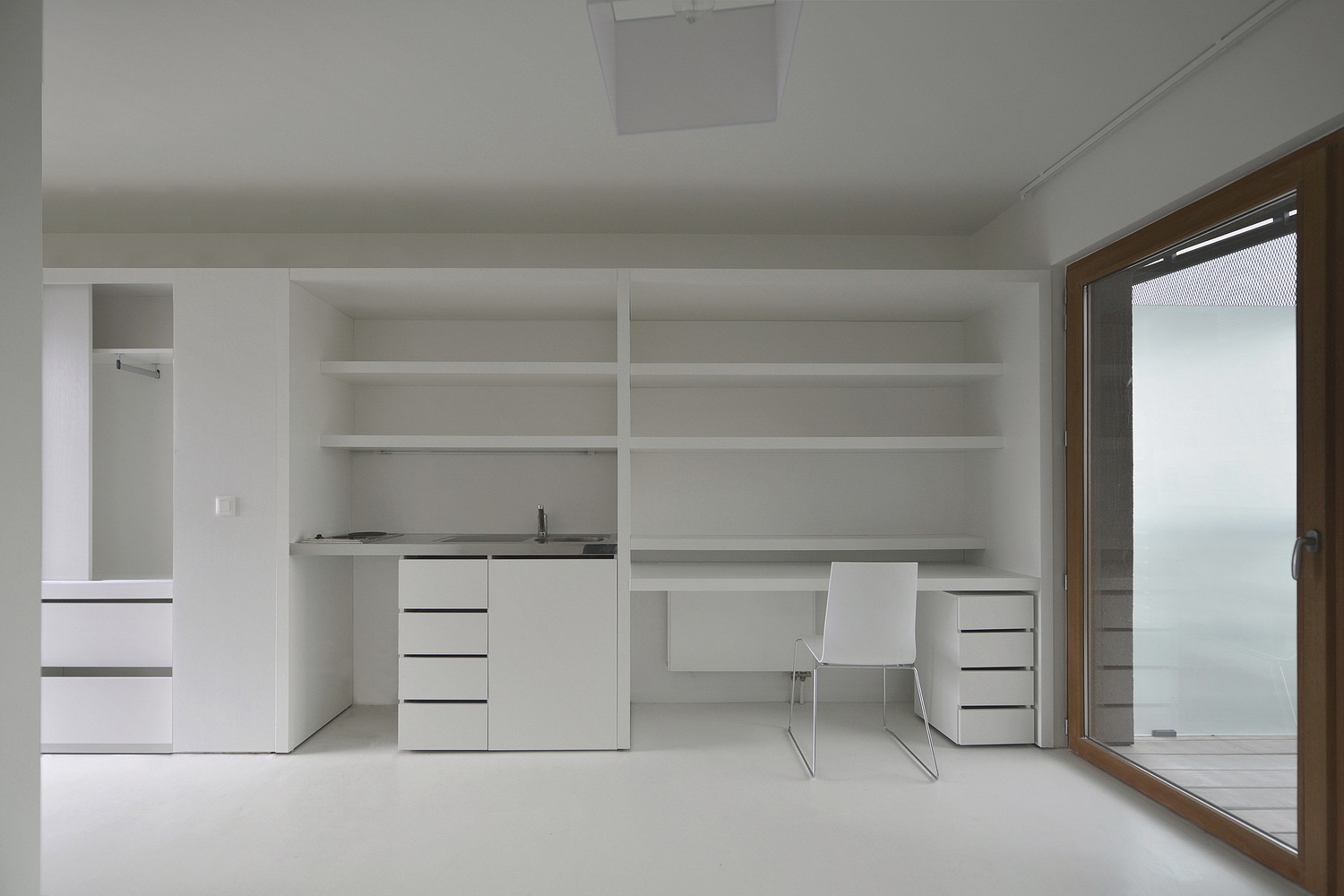 The long volume of the building is divided into two parts connected with a narrow bridge. Between two volumes there is a garden. The building has 11 floors: a technical space in the basement, shared programs in the ground floor, and student apartments in the upper nine floors. The layout is very rational and modular.