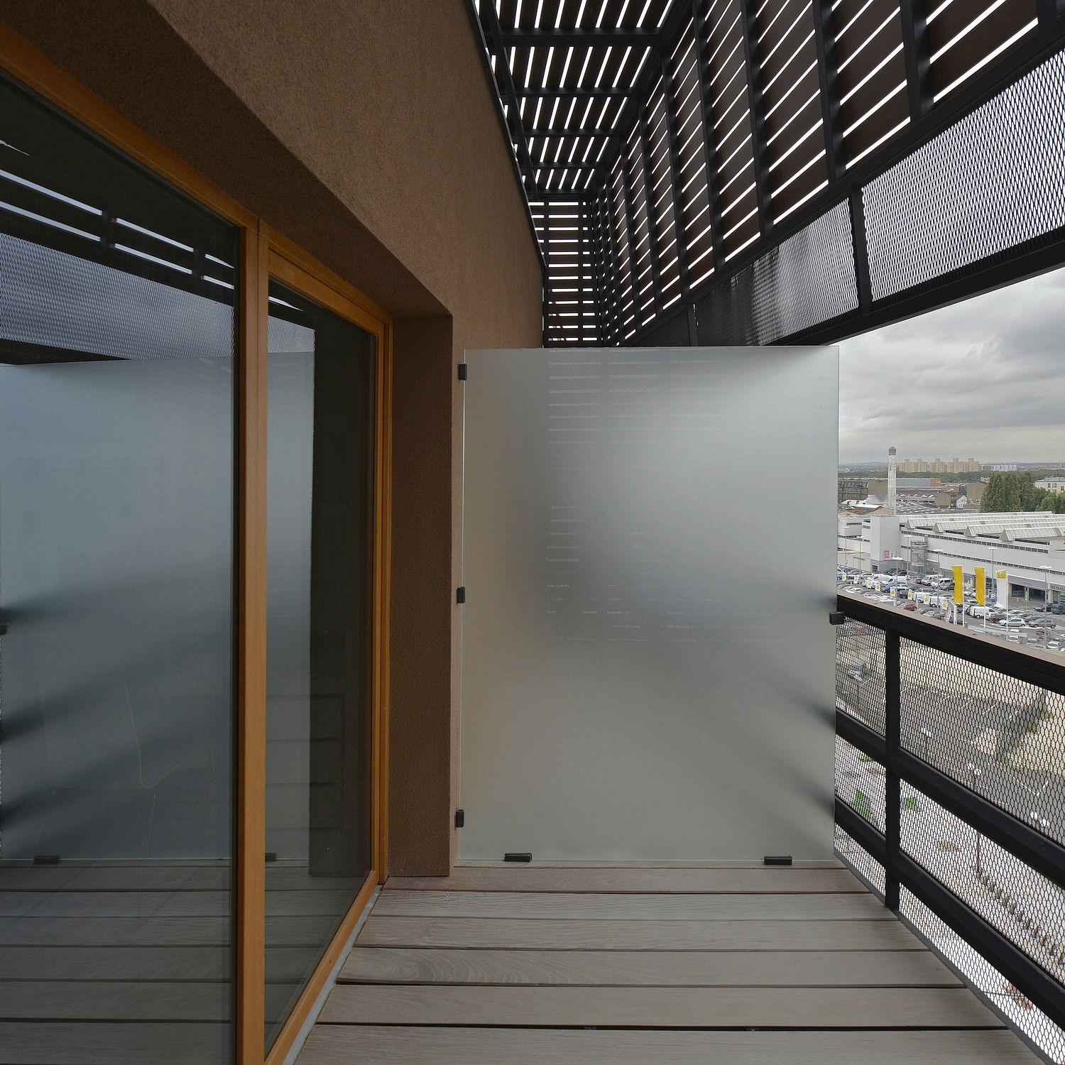 The major objective of the project was to provide students with a healthy environment for studying, learning and meeting. Along the length of the football field is an open corridor and gallery that overlooks the field and creates a view to the city and the Eiffel tower. This gallery is an access to the apartments providing students with a common place. All the studios are the same size and contain the same elements to optimize design and construction: an entrance, bathroom, wardrobe, kitchenette, working space and a bed. Each apartment has a balcony overlooking the street.