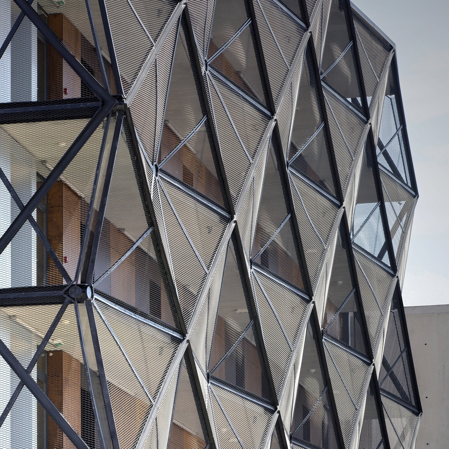 The elevation towards the football field has an open passage walkway with studio entrances enclosed with a 3D metal mesh. Both volumes are connected on the first floor with a narrow bridge which is also an open common space for students.