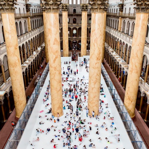 The Beach, designed by New York-based practice Snarkitecture, spreads across a 10,000sqft (929sqm)space in the former US Pension Bureau HQ –the National Building Museum was conceived by US army officer and architect Montgomery C Meigs. A walled mirror gives the impression of an endless ‘ocean’ while a 50ft (15 metre) wide shoreline is sprinkled with beach chairs and parasols to replicate the experience of visiting a real beach. Gallery-goers can plunge into the plastic ‘water’ or lounge around, soaking up the architecture.
