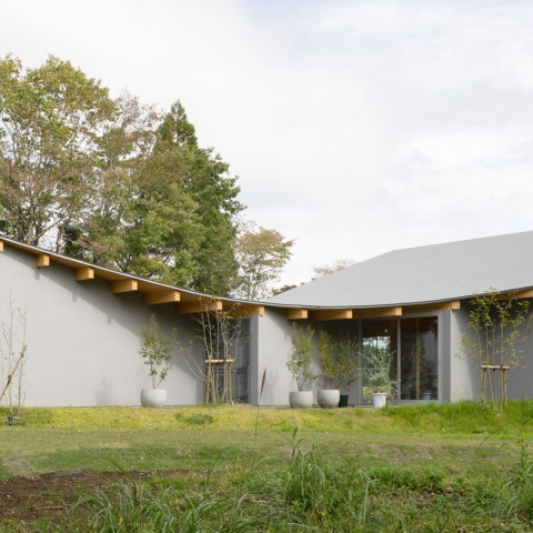 The façade facing the street displays a primitive sectional outline harmonized with the other houses at first glance, somehow one side of the roof stretches low then rises in curve towards the direction of Mt. Fuji, providing an indigenous scenery from the lounge under the inverted-vault ceiling. The rectangular volume, slightly shifted to touch the round edge of the roof at its corner, also expands itself in a differentiated arrangement yet without changing the orientation. This particular movement extending the gable roof in a curvilinear way engenders the welcoming gesture of the eaves at the entrance that open up like drapes drawn to the side. We expect the Reception on the ridge to be a place for integrating the grand nature and the hotel units both visually and emotionally to salute visitors to the area as a whole.