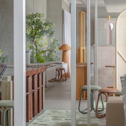 Grzywinski+Pons also designed all of the furniture in the rooms and on these pieces we turned the dial further on chroma, warmth and texture. Turmeric chairs, pastel mirrors, and heavily braided grass rugs are juxtaposed with suede and rattan floor screens and bedheads. The lighting is as essential to the serenity of the space as it is practical. We designed it to pool and graze as much as to illuminate.