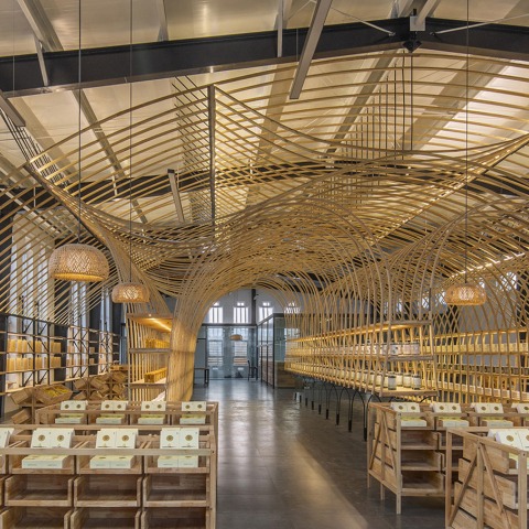 The bending of thin panels obtains stress that enhances structural stability. Each wooden panel elements with a different curvature is an "arched" stress unit. The "arched" units anchor each other, with the bottom ends reaching the display stands. Therefore, the physical structure of these elements is also the form of force transmission. It is a structural element and also a functional component of display furniture. The modulus of display shelves fits into the varied sizes of agricultural products, and the structural components function as display shelves as well. The timber elements are extended and "suspended" under the portal steel frames, producing a natural atmosphere in the existing space.