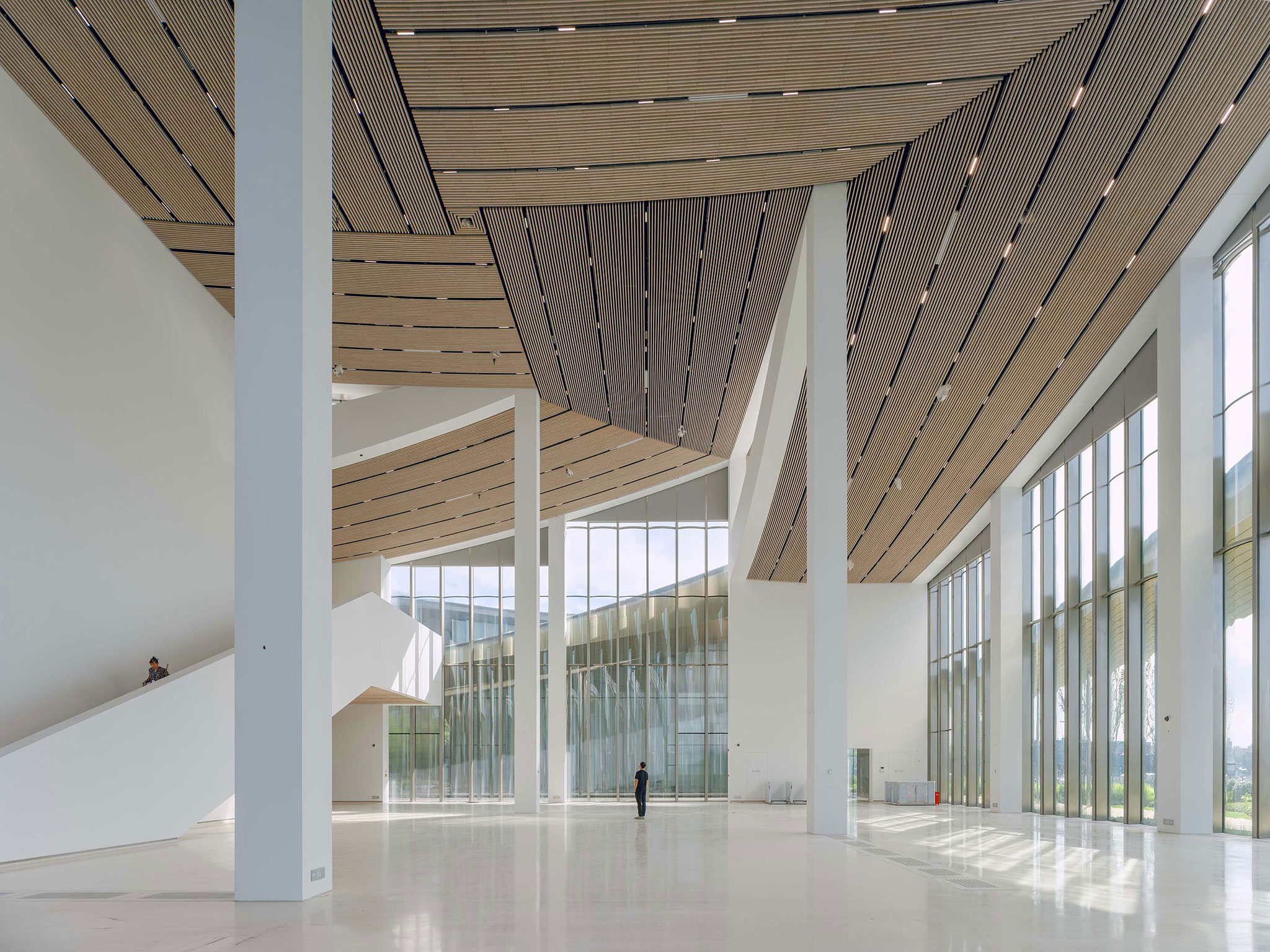 The museum's architecture draws inspiration from the Suzhou garden tradition, reinterpreting the "lang" (廊), a long covered walkway. Ten interconnected pavilions are unified under a continuous roof whose gentle undulations evoke the silhouette of tiled eaves. The two remaining pavilions will be built next year, extending over Jinji Lake and connecting to the main structure via covered walkways.