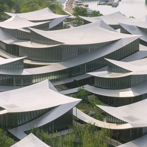 Suzhou is the birthplace of the Chinese garden. Our design for the Suzhou Museum of Contemporary Art is conceived as a garden of pavilions and courtyards. The individual pavilions are linked by glazed galleries and porticoes, creating a Chinese knot of interconnected sculpture gardens and exhibition spaces. Intertwining between the legs of a waterwheel, the museum branches out like a rhizome, connecting the city to the lake. The result is an artificial labyrinth of plants and artworks in which to lose oneself. Its nodal logic is only clearly appreciated from the gondolas. Facing the open space of the lake, the gently conical curve of the roofs creates an elegant silhouette on the shore. From above, the stainless steel tiles form a fifth façade. - Bjarke Ingels, Founder and Creative Director, BIG.