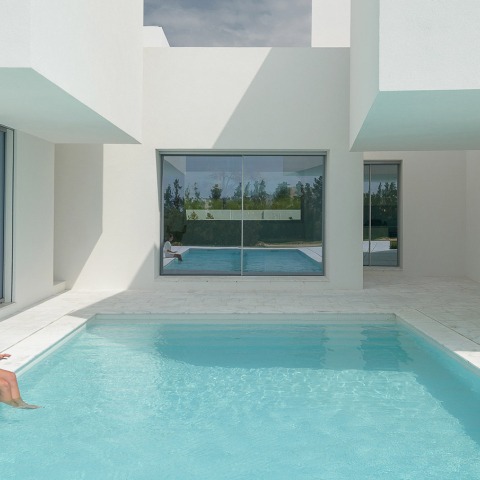 Two white walls (almost) completely withdraw any direct contact from future neighbors, setting clear boundaries. Between them, an architectural inner landscape of cubic shapes, each arranging a single function, provides a sense of security and protection while carefully framing the distant landscape. Only a horizontal volume, containing the swimming pool, contradicts this logic projecting itself to the South, emerging from the walls to offer a possibility of volunteered exposure, for a brief moment, before returning to the house.