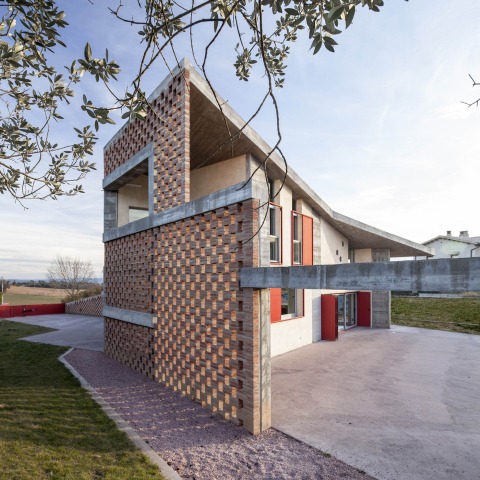 Build the house as hierarchical process, which was also useful to think it, adding elements and processes. A precise and crucial concrete structure, necessary to support the outer skin and win the war in the first battle. Add the rest and cover the whole: a lattice brick wall, rendered walls and carpentry work to one side and window shutters at the other.