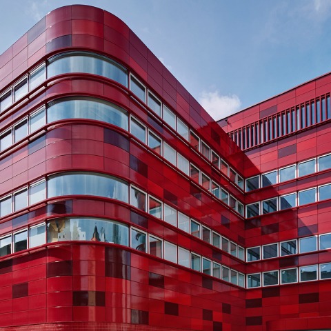 The building elevation is finished with ceramics including small ceramic tiles on the ground level and glazed ceramic panels on the upper floor levels. The upper levels consist of more than 2000 ceramic elements. Among them 50x100cm flat panels, vertical blinds and (for the first time in Poland) curved panels of 145cm and 195 cm radius. Three different shades of red were implemented to create irregularity on the surface of the all four elevations. These shades symbolize the variation of color in blood. The color of blood, oxygenated in the lungs and flowing in the arteries, is bright red, while blood flowing in the veins, containing carbon dioxide, is dark red. Ceramic pipes (TERRART®-BAGUETTE), placed at the uppermost level, protect the conference room from overheating as well as hide complicated and massive technological systems located at the roof level. These ceramic pipes add detail and make the enclosure lighter in its appearance.