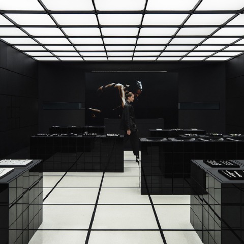 The whole arc-shaped hot curved glass was at the bottom, and the dark green to black color changed. A strange device created with the core inspiration symbols, like a spider's tentacle, stood between the window, blurring the boundary between art and retail.