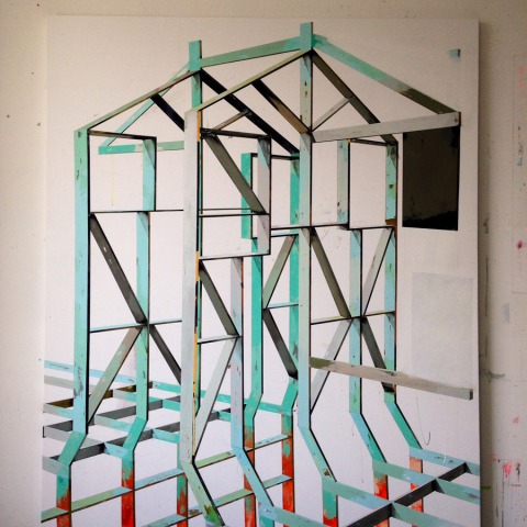 This exhibition contains seven works that compose and reveal the several different steps in a creative, unique and particular course. We encounter a sketch painted directly onto the gallery wall, a chalk drawing on slate that is the draft for the outline of the whole exhibition, a sculpture that provides an embodiment for the elements dealt with in another work, which is also present, and now in three dimensions, as well as several paintings that are mutually shattered and deconstructed, in a sea of references and multiple meanings that are continuously reinforced and enriched.