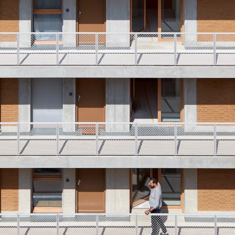 Like a superposition of inhabited earthen strata in the heart of the district, the unique mud brick façades of this 42-unit building form a sort of backdrop for the exterior corridors.