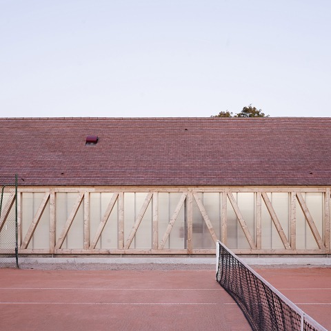 Special attention has been given to this small scale building, designed to house the changing facilities and lavatories of the tennis complex, in order to ensure it harmoniously blends in with its surroundings. This is achieved through a demonstration of the contemporary relevance of half-timbering, a traditional Norman structural principle. This type of construction presents the added benefit of a sustainable reliance on local companies, materials, and skills. Here, the terracotta roof tiles were manufactured in Bavent, a town close to Cabourg.