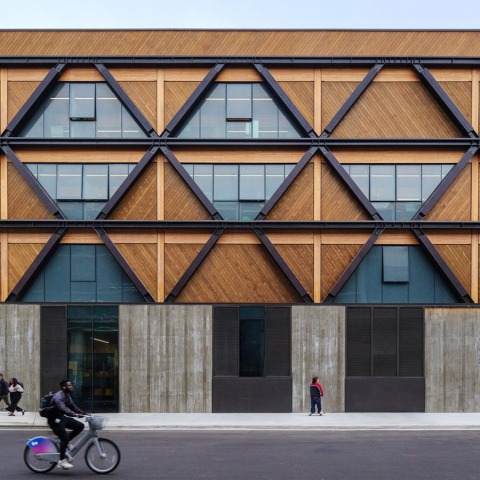 The project is among one of the first buildings to feature solid wood structures in California. Its materiality and diagonal structure showcase the building's load and gravity challenges, exhibiting the building's ambitious sustainability goals. The building utilizes a passive design with self-shading facades and night ventilation, naturally cooling the building.