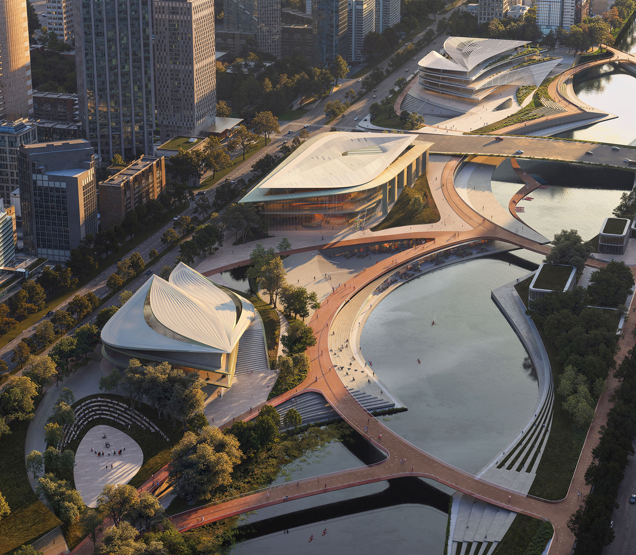 ZHA Architects, Qiantang Bay Cultural District, Hangzhou, China. Rendering by Proloog.