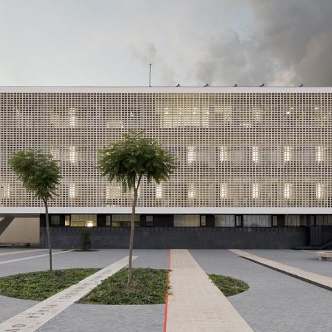 The consulting area is a black prism covered with ceramic lattice which is supported from the ground floor. A single, very expressive column separates the entrance courtyard from the remaining public space.