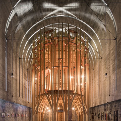 The Chapel stands in wood. In its upper part a space reserved for the inhabitants of the Seminary is created and its lower part functions as a filter between the profane space and the sacred space. The space is endowed with a great acoustic quality, its acoustic sandwich panel composition on the roof and the elongated shape of the vault are what facilitate this acoustics.