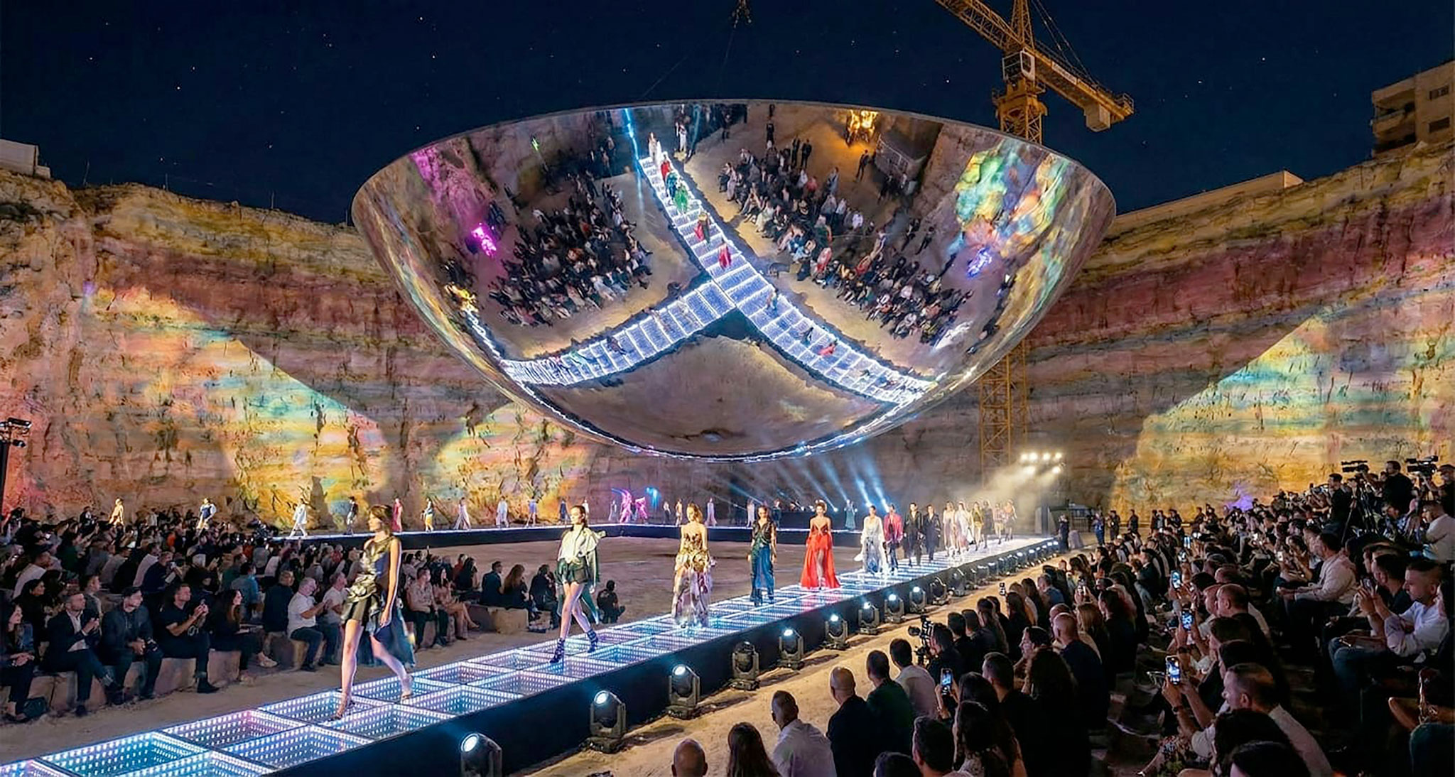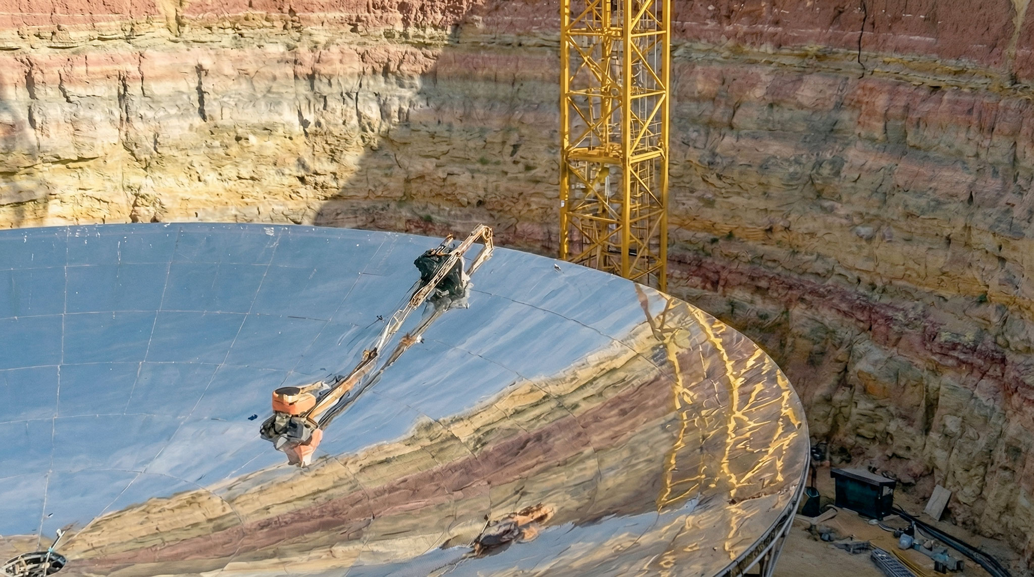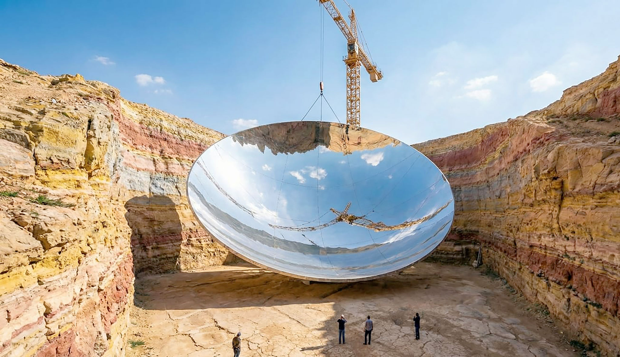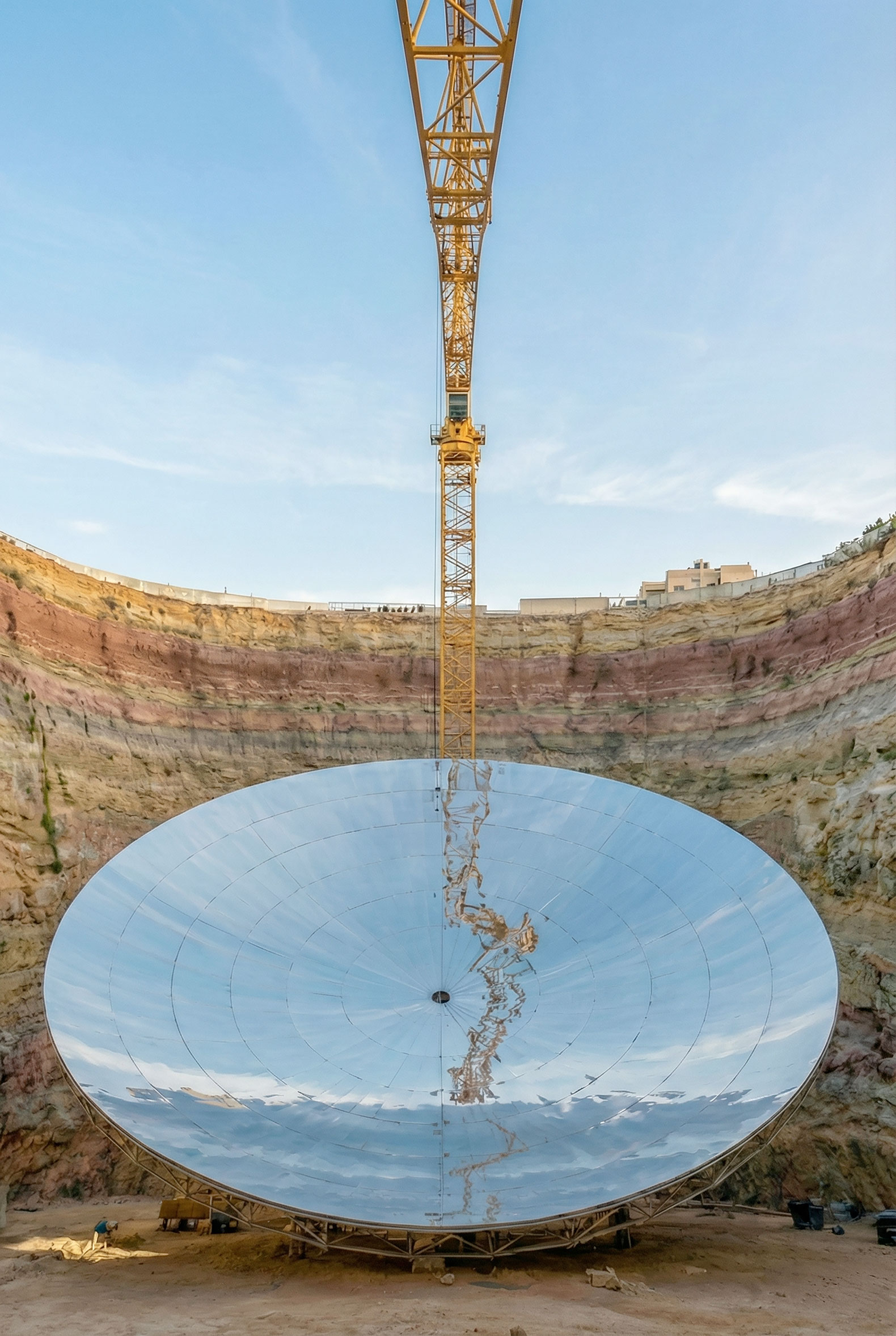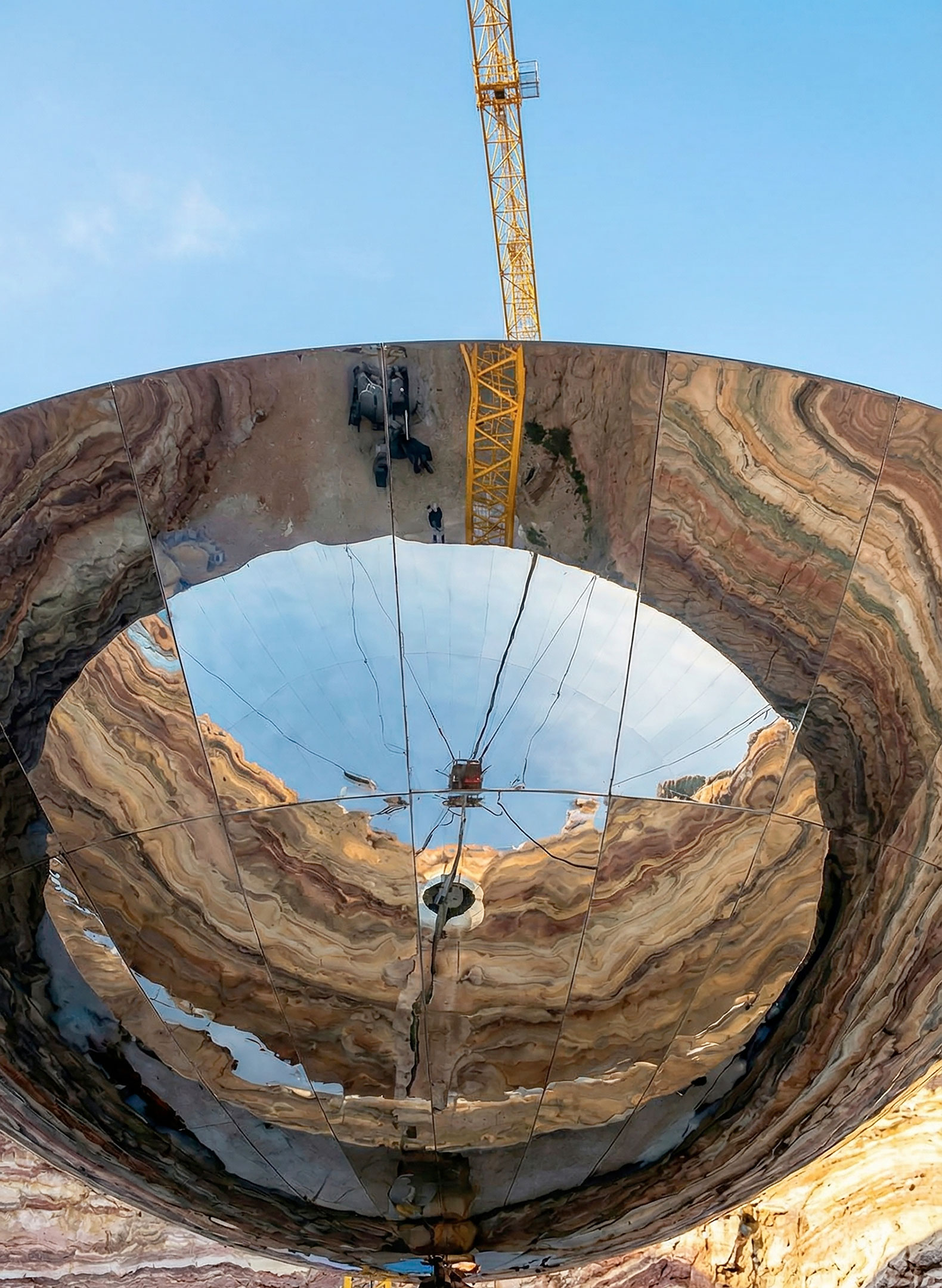 Suspended above the void is a giant convex mirror—an eye hanging in the air—that captures the city's sky, its clouds, and its constant motion, and pours them inward, projecting them underground as an alternative sky. Here, the human experience is inverted: the visitor does not descend to confront the soil, but to see the city suspended above them—as if the sky had fallen downward, and the depth had become a mirror of the surface. Two temporalities—the immediate and the geological—merge into a single panoramic scene, where fragility and solidity coexist.