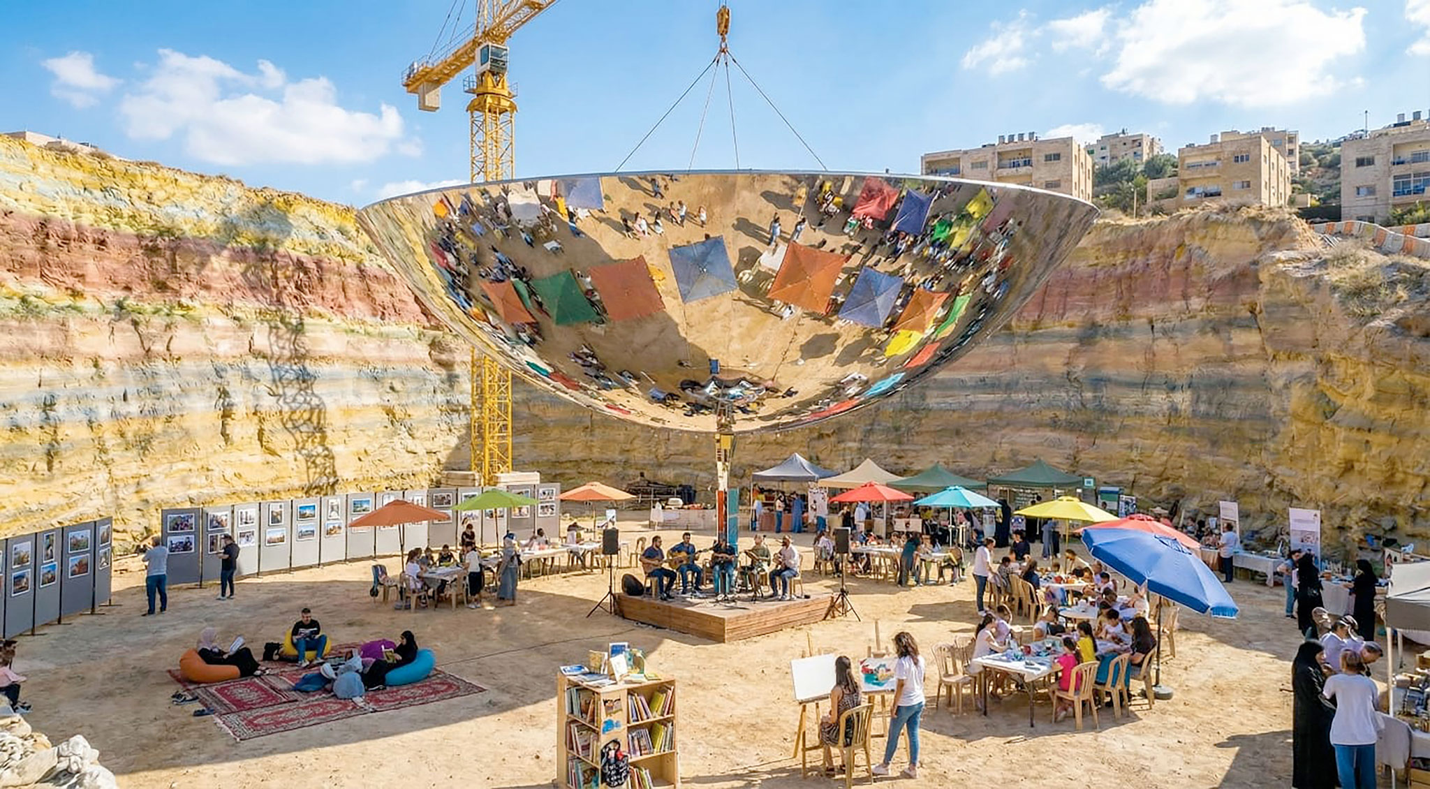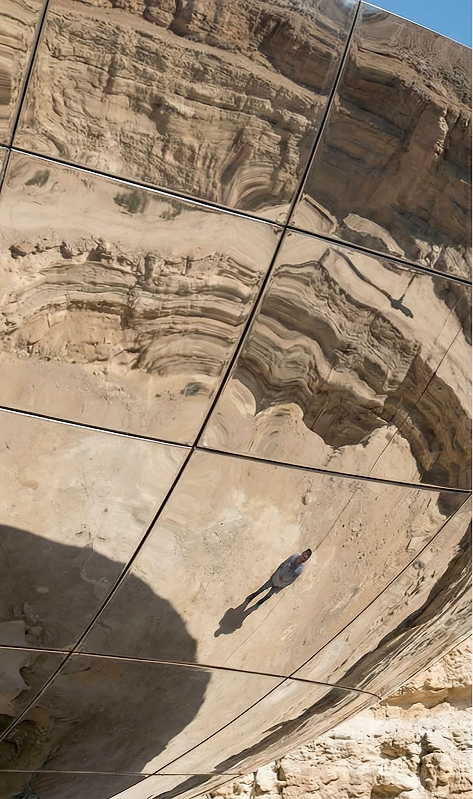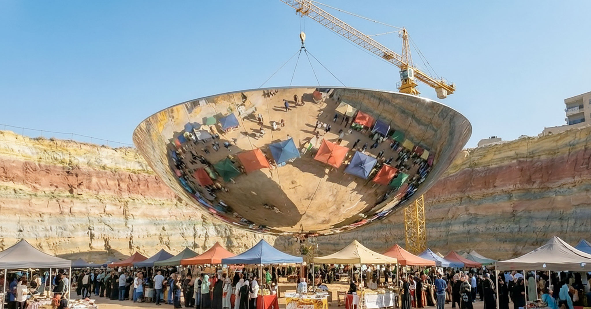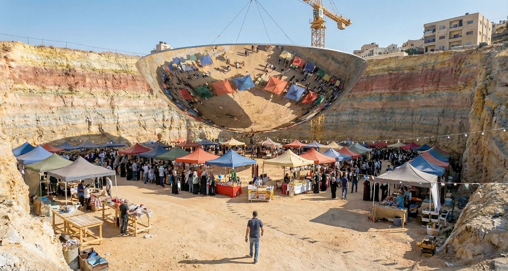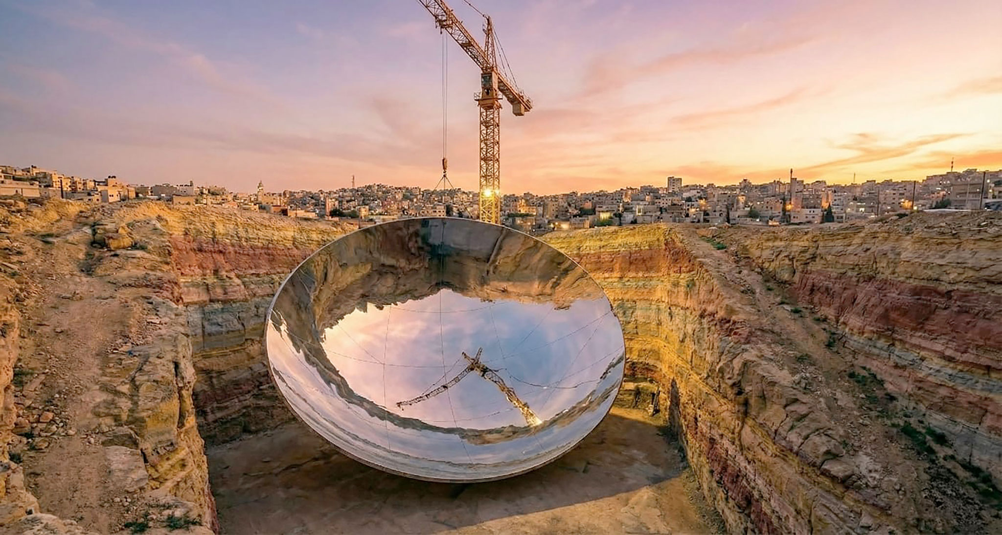 Wassim Abu Hazim's intervention in the Jordanian landscape unfolds with a large convex mirror suspended over the void, capturing the sky and the city's constant movement and projecting them underground. Through this intriguing strategy, visitors descend and experience both immediate and geological temporality in a unique panoramic scene.