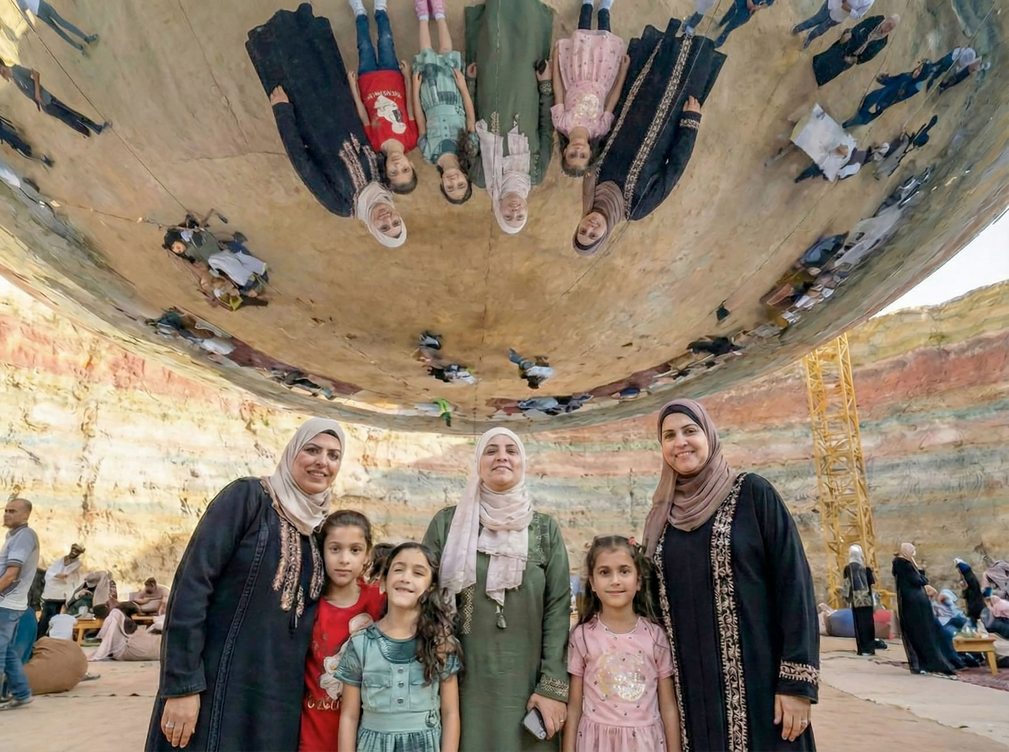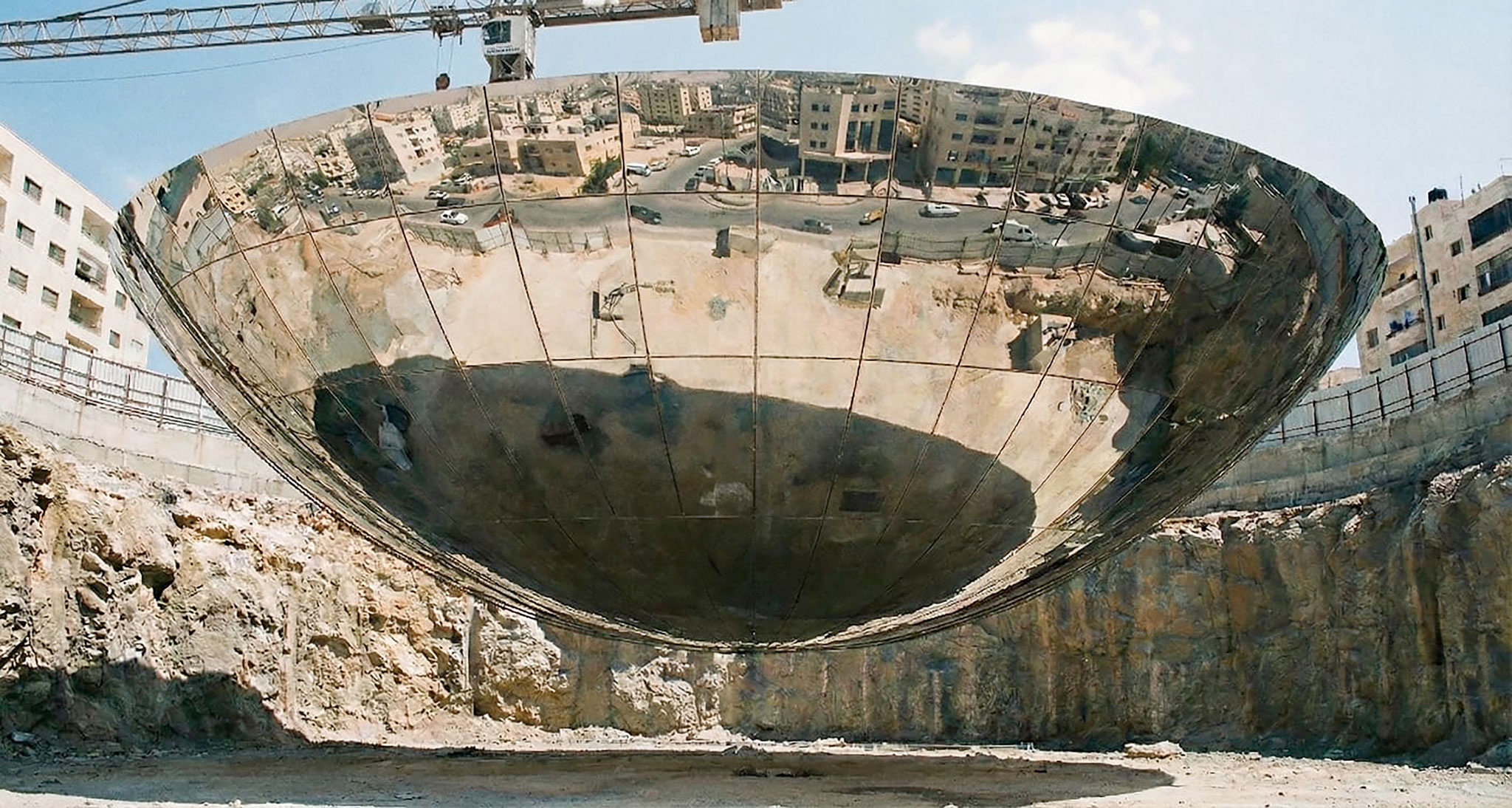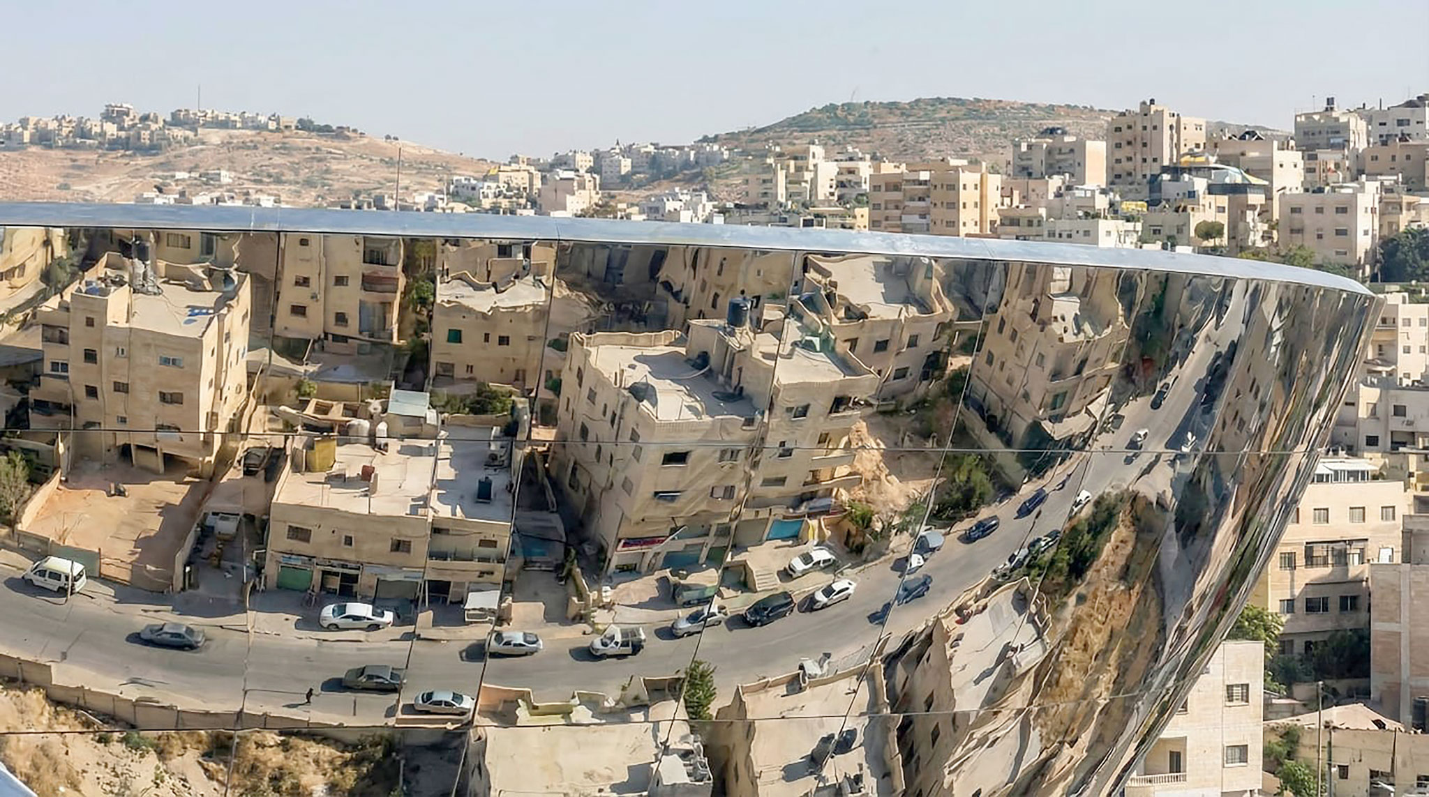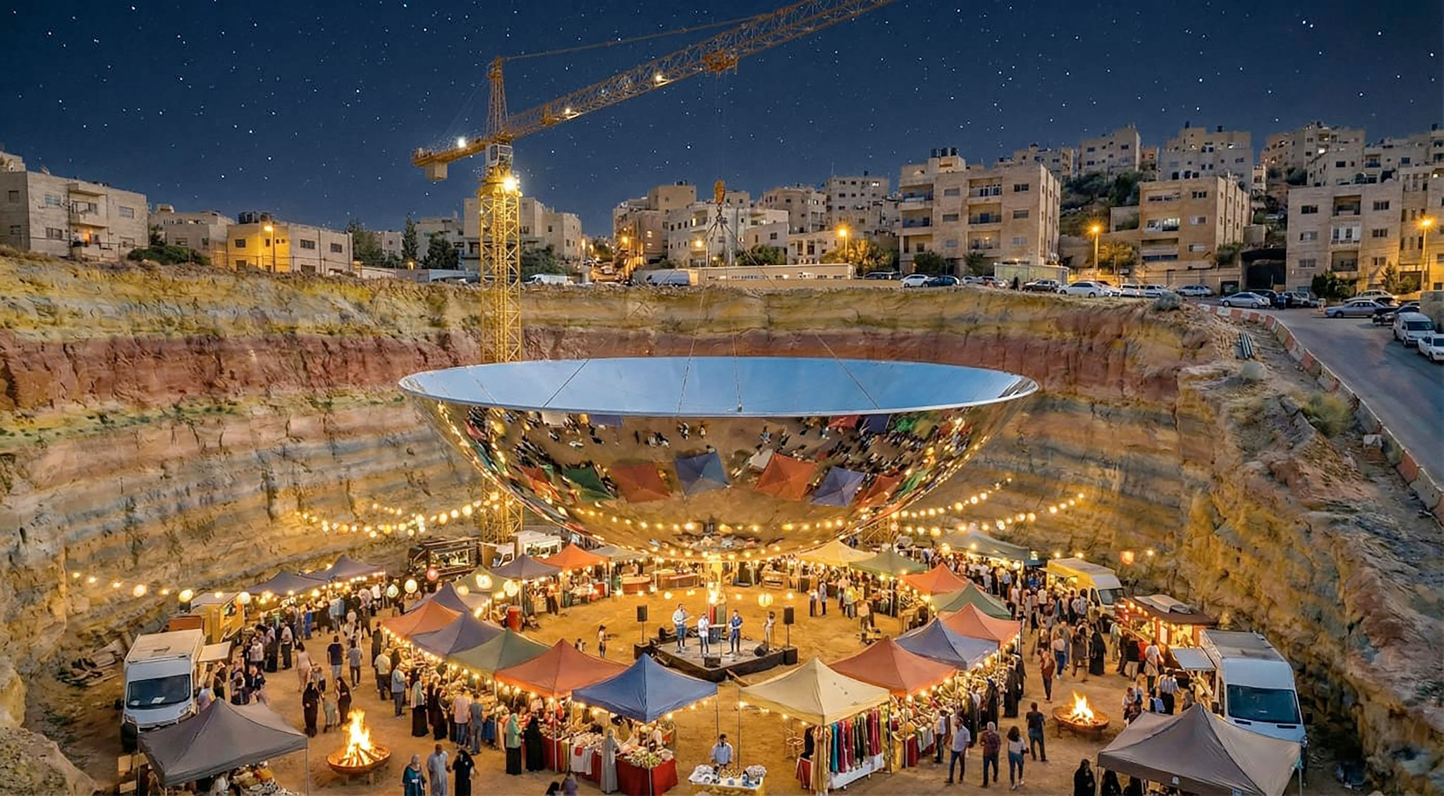 Wassim Abu Hazim's intervention in the Jordanian landscape unfolds with a large convex mirror suspended over the void, capturing the sky and the city's constant movement and projecting them underground. Through this intriguing strategy, visitors descend and experience both immediate and geological temporality in a unique panoramic scene.