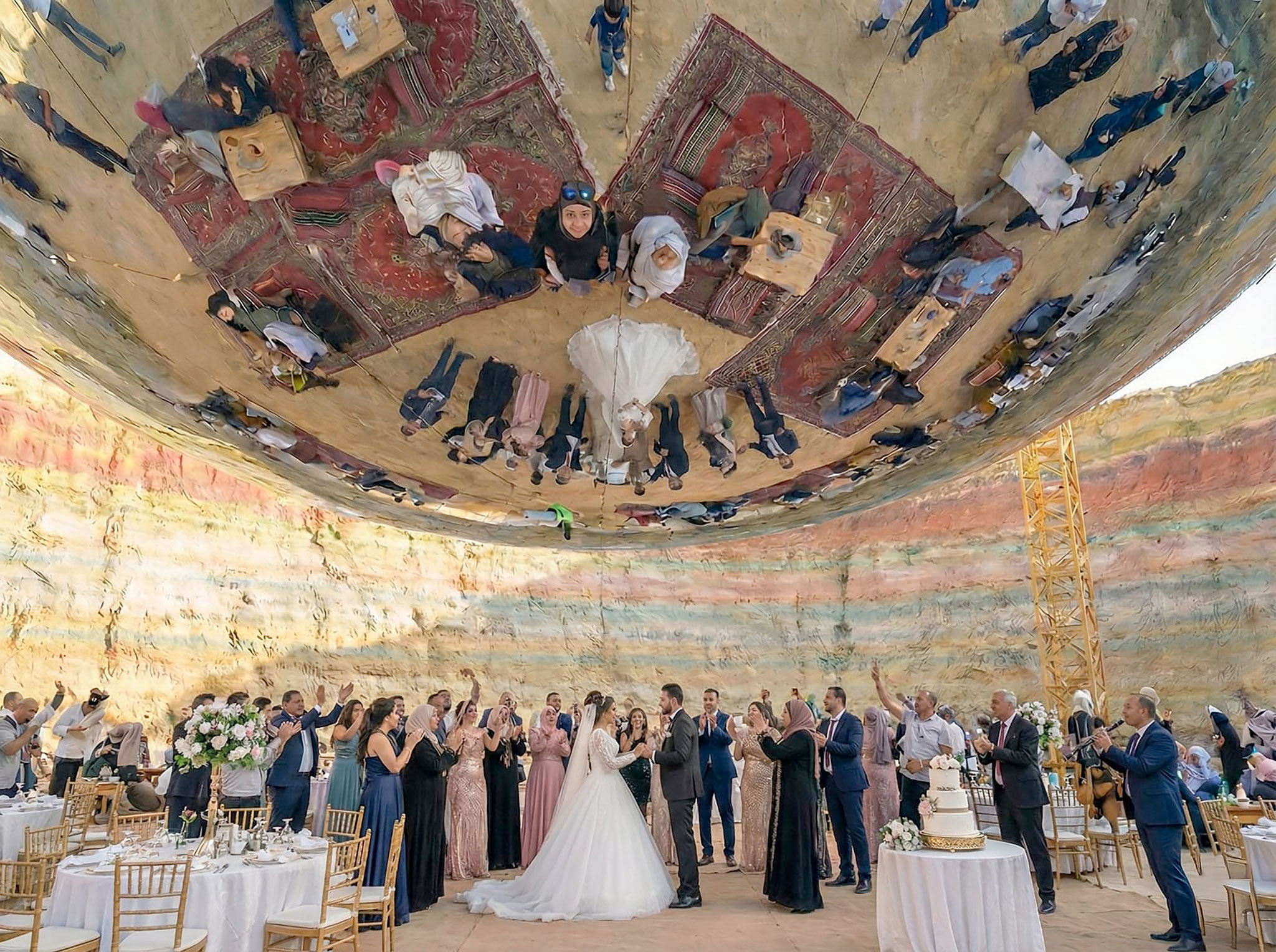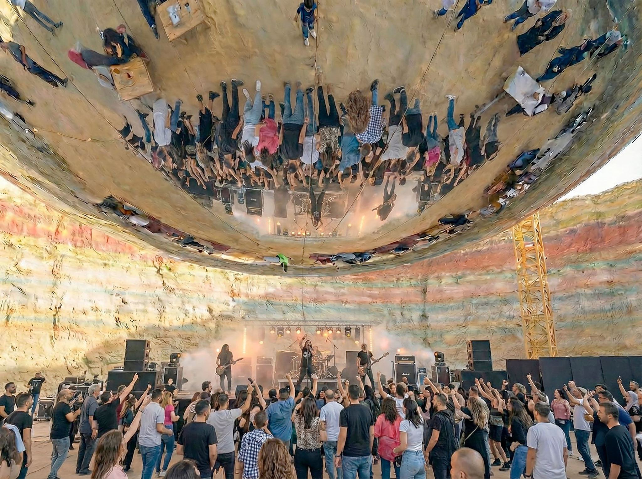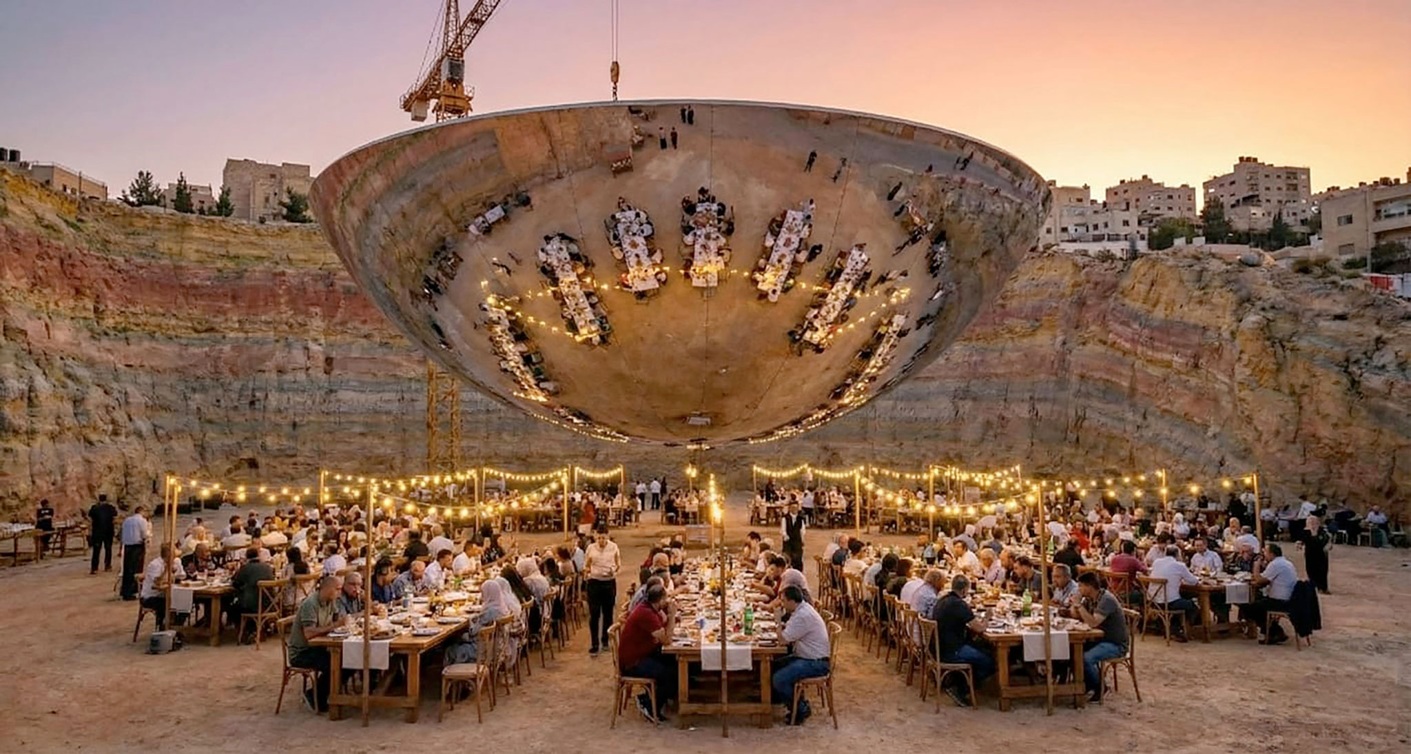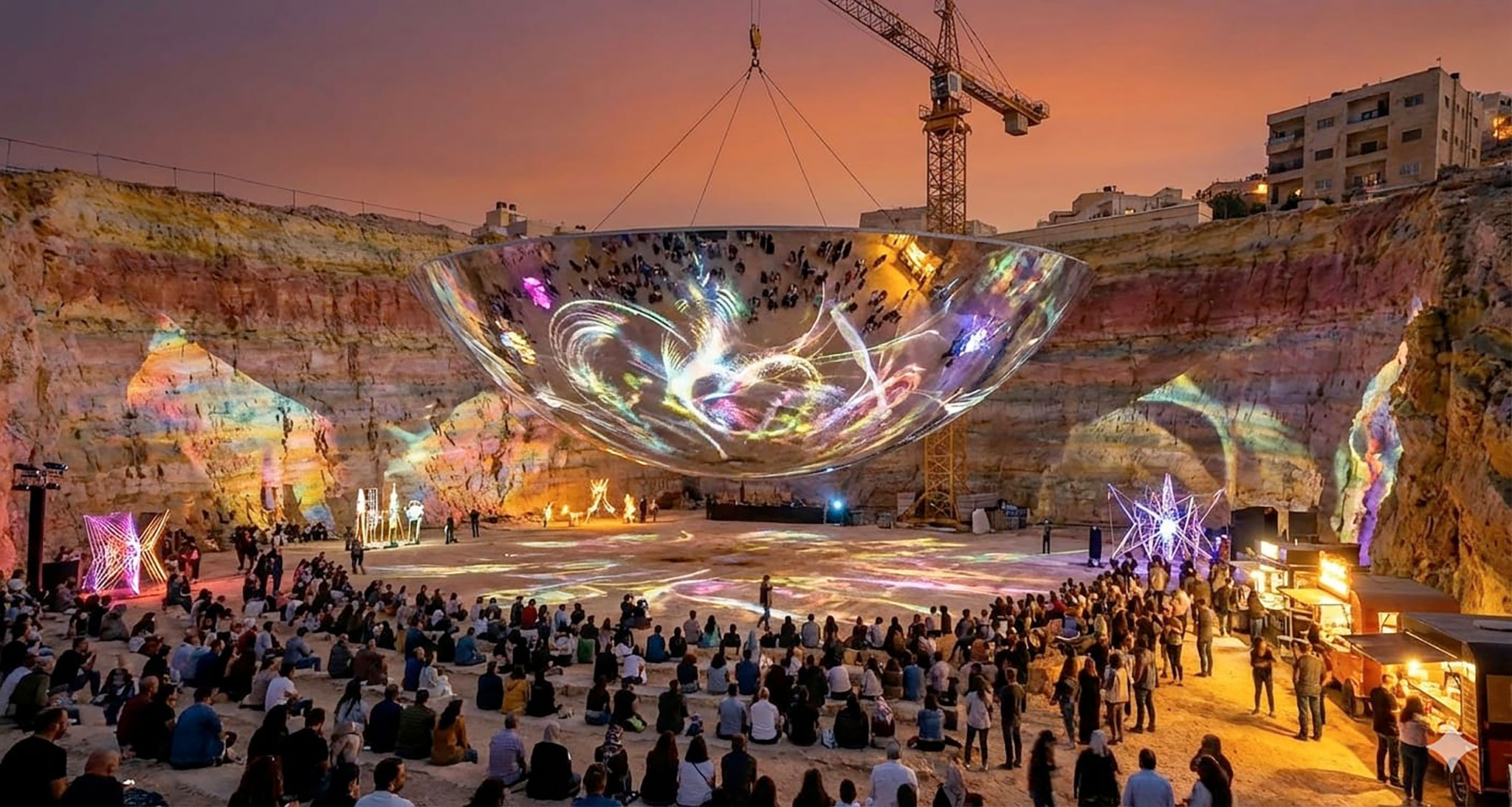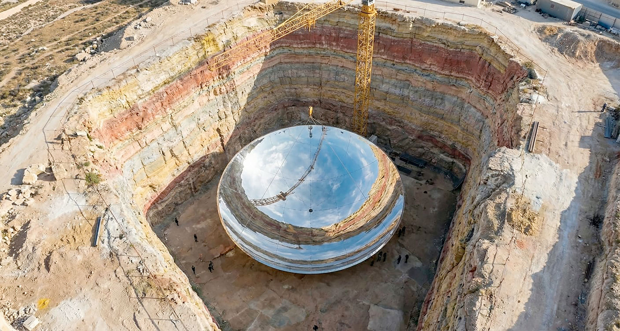 Wassim Abu Hazim's intervention in the Jordanian landscape unfolds with a large convex mirror suspended over the void, capturing the sky and the city's constant movement and projecting them underground. Through this intriguing strategy, visitors descend and experience both immediate and geological temporality in a unique panoramic scene.