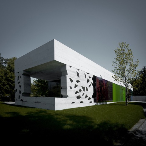 The visitors’ room and the covered exterior space are orientated towards the most beautiful point overlooking the lake, and where small ceremonies can be held. Two perforated, ornamental concrete wall elements in the covered outside area create a protective but simultaneously solemn atmosphere. The archaic concrete construction contrasts pleasurably with the lightness of the glass façade, creating an abstract symbolism. The coloring of the panes of the façade in various tones of green and brown makes the pavilion part of the natural surroundings and is tied to a long tradition of applying colored glass in the sacred buildings of different cultures. The architectural expression of the building is intended to help the mourners in coming to terms with the exceptional circumstances in which they find themselves, and to provide a dignified and contemporary setting for the mourning rituals of all confessions.