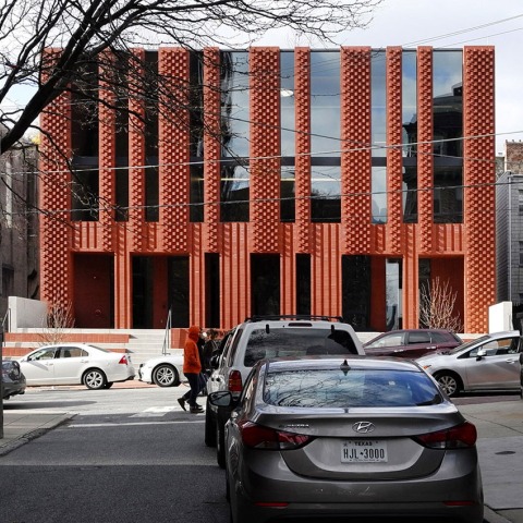 Drexel University’s Hillel House, projected by Stanley Saitowitz / Natoma Architects, is arranged on four interconnected levels, the square building has thickened side walls which contain services, and four central columns which structure the middle, front and rear.