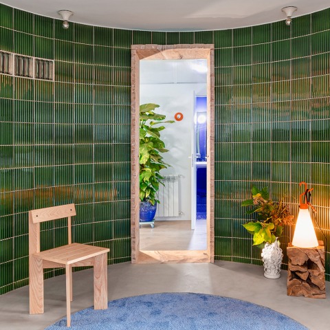 A central intervention in the project is the glazed ceramic curved wall with a 175-degree arc, an element that disrupts the rigid layout of the original apartment. This wall serves not only as a functional organizer of space but also as a material statement resonating with the local context and its traditions. Beyond its visual appeal, the wall redefines the logistical conventions of domestic storage and transforms the apartment into an adaptable, multifunctional space. It integrates a series of cupboards, cabinets, kitchen furniture, bathroom fixtures, shelves, and closets, each maximizing the use of available space. At one vertex, the wall merges with a mirrored showcase that conceals conventional appliances, enhancing the sense of fluidity and openness in the space.