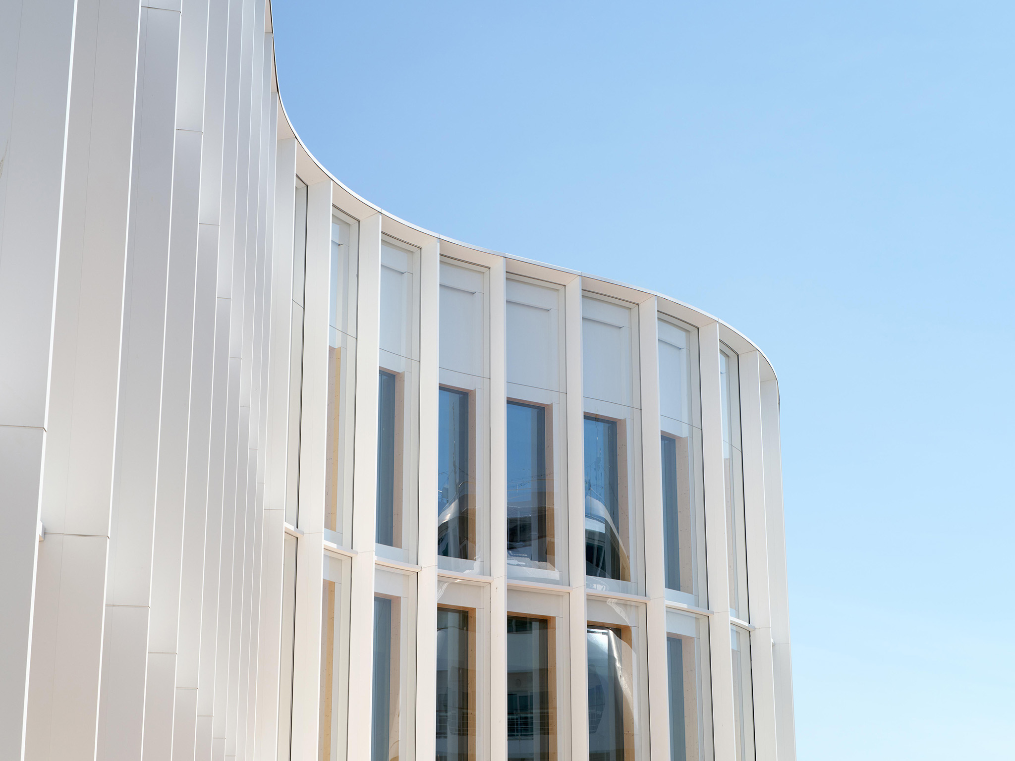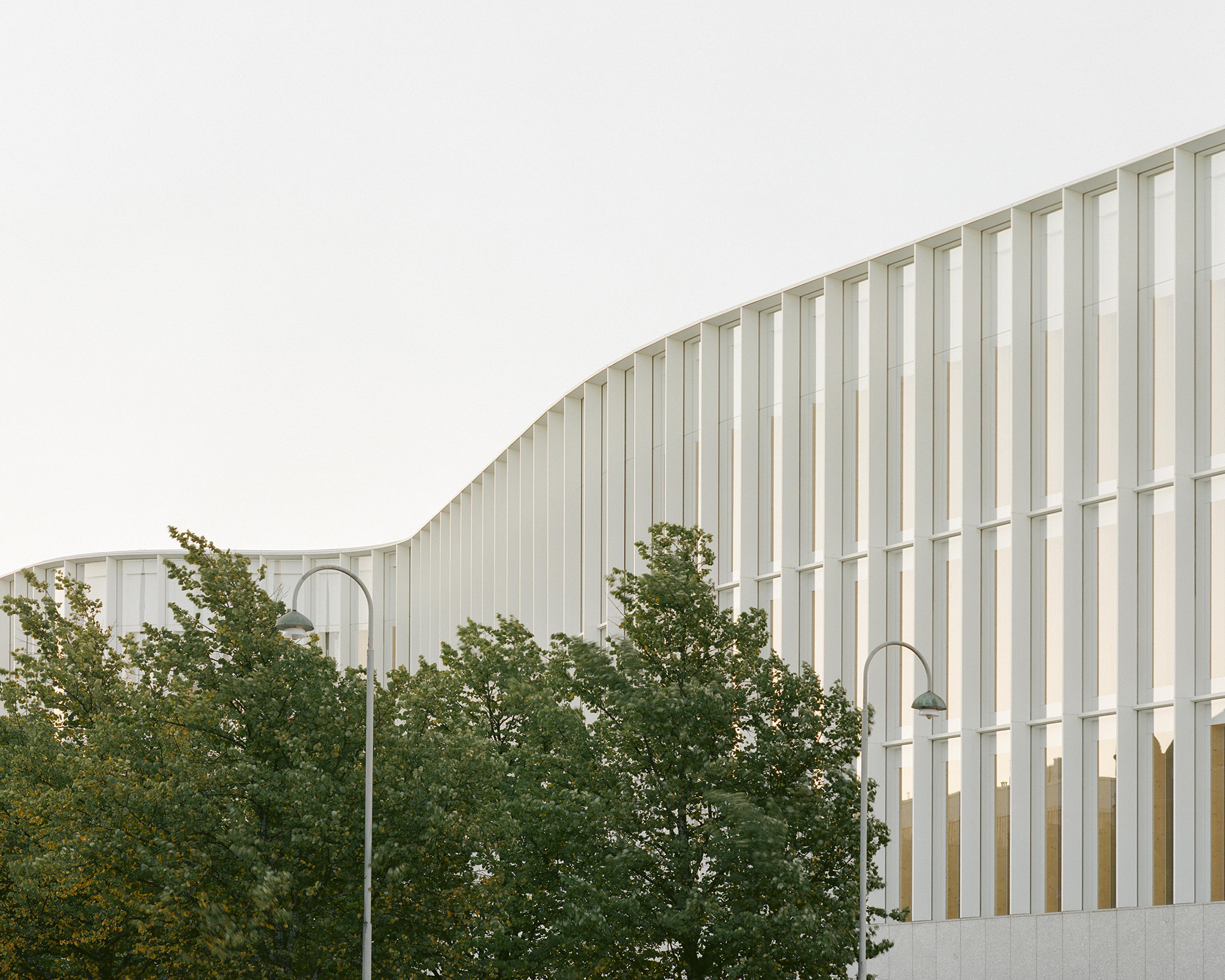It continues the uniform, neo-classical silhouette of Helsinki along its southern waterfront, while the meandering shapes of its façade break its scale, connecting it to the diverse and layered building stock of the Katajanokka peninsula. A double-structure on the façade with an outer layer of glass, aluminum, and granite that protects the exposed wood structures from the maritime weather connects the building to the wider cityscape and gives it a unique character that changes with the time of day and the four seasons.