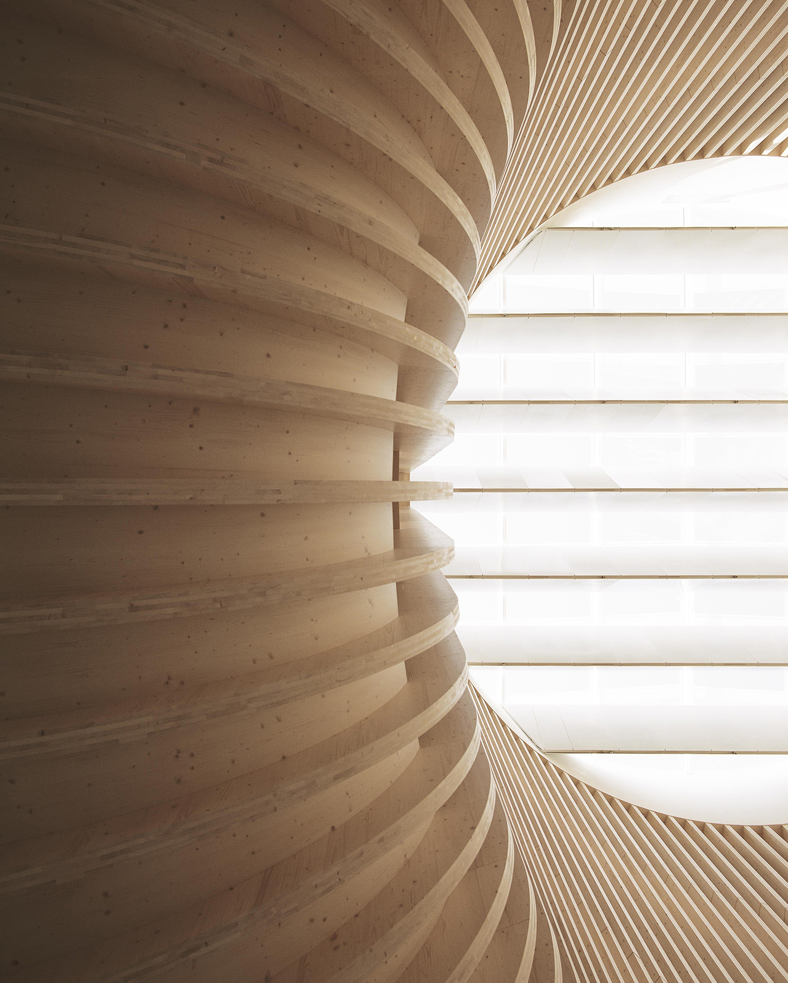 The structure is composed of 7,600 m³ of spruce and 2,500 timber elements. The structural system utilizes standard industrial prefabricated products, optimizing the use of materials and renewable resources. The layout of the interior spaces also ensures maximum flexibility and adaptability throughout its lifespan.