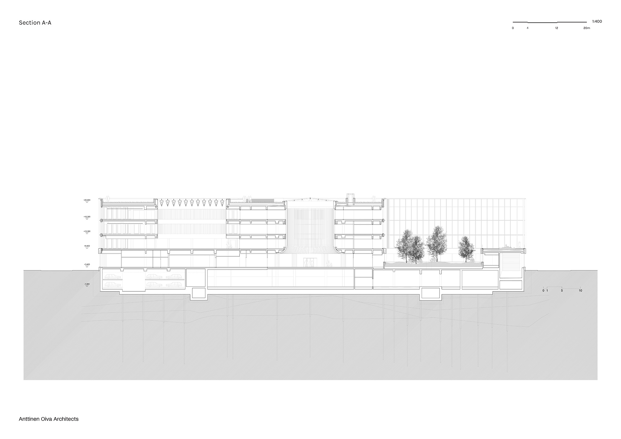 The building has four floors above the ground, a publicly accessible green rooftop terrace, and a basement that houses technical facilities and parking. The building was designed as the new head office of the leading Nordic forestry company Stora Enso, and half of it is occupied by a hotel. The street-level spaces connect to the surrounding city on both sides and feature a large, shared open foyer, restaurant, café, and conference spaces. The structural system and the design of the spaces allow for maximal flexibility and adaptability of the interior over a long lifecycle.