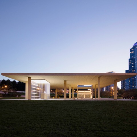 Radical simplicity underlies a subtle and varied experience. The lateral reach of the roof recalibrates the experience of two extremes of the Chicago landscape: at ground level, the Lake Michigan horizon dominates, forming a line of symmetry between ground and canopy. From the viewing platform, the roof becomes a new artificial horizon, shutting out the foreground and emphasizing the vertical skyline above an abstract floating plane.