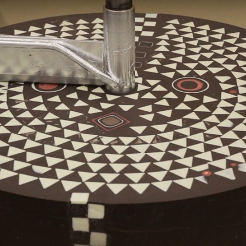 The Confrontation exhibit showcases similar creative collaborations where disparate industries were brought together to create anything. This chocolate mill features geometric white chocolate patterns that change with each layer of the chocolate block. By sliding a sharp metal piece around the top face of the dessert wheel, the finest layer of chocolate is shaved off, revealing different designs all the way down to its base. Citing a new way to taste and share chocolate, this novel exhibit is a one of a kind experience.