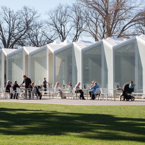 The long, white structure is based on a traditional industrial greenhouse. “Dappled leaf shadow” elements keep staff and visitors feeling comfortable, even on the hottest days.