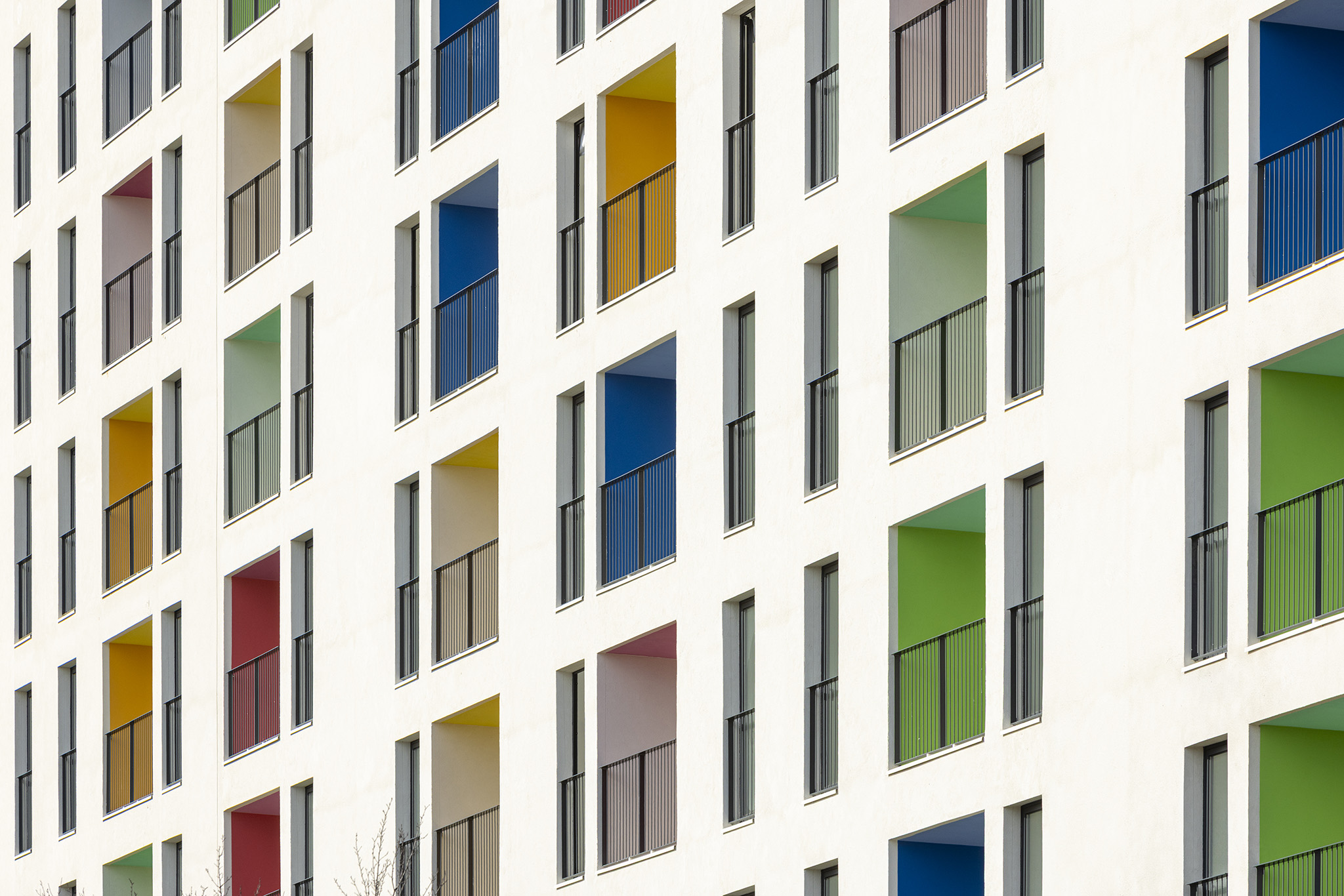 The building's urban presence is addressed at two scales: on the one hand, at the city scale, a striking white volume with clean edges is defined, sculpted by the terraces of the apartments, which are treated as notes in a chromatic symphony, in the style of Aleksandr Scriabin. This musical façade presents itself optimistically to the city, seeking to uplift its observers.
