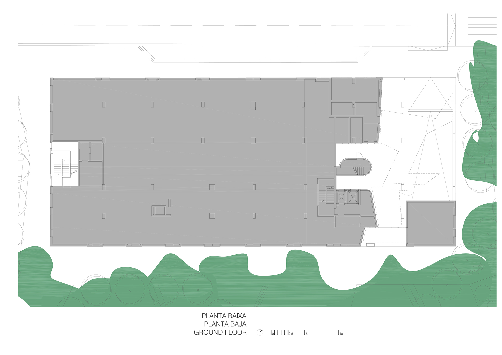 On the other hand, at street level, the ground floor access spaces open up as a continuation of the urban space. This creates a direct connection with the adjacent park, opening up views and establishing new urban continuities in the neighborhood, incorporating urban greenery as part of the building.