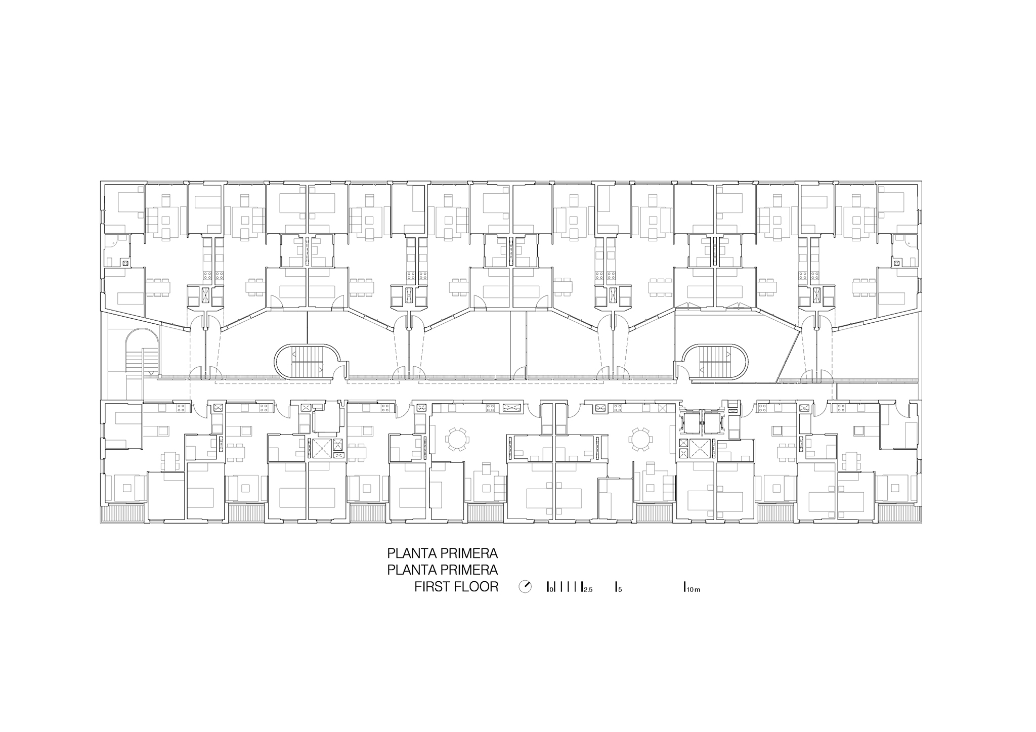 The 110 apartments are distributed across 7 floors, with 16 units per floor. Eight face the northwest façade and eight face the southeast, with recurring layouts. The first-floor terrace, above the main commercial space, offers communal areas for residents. The desired sense of community is reinforced by the distribution of circulation routes along open walkways.