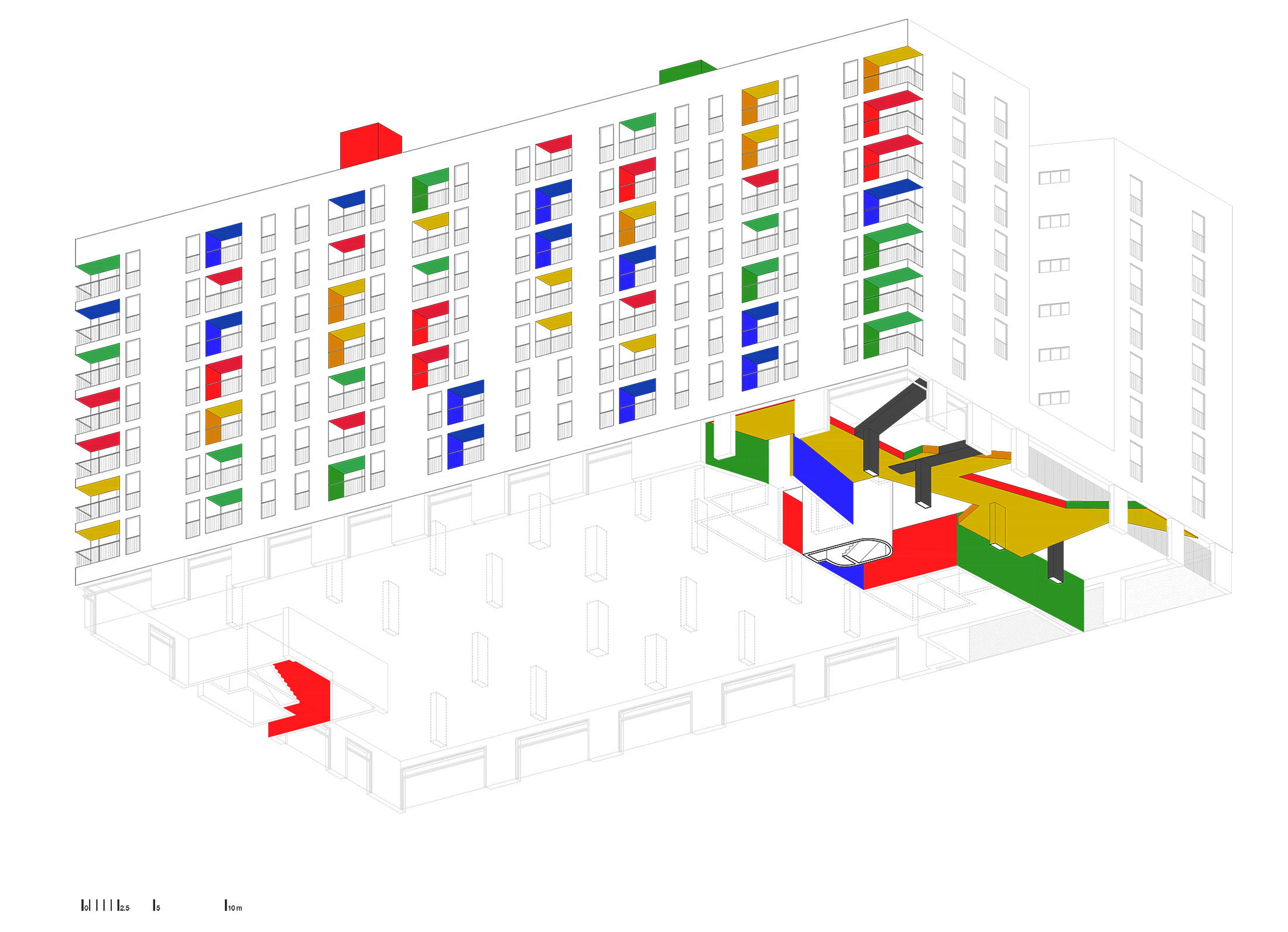 The building's main lobby, which includes the ramp leading down to the parking garage, is treated as a key element of the complex. The different colors found throughout the building converge here, serving as a grand opening to the chromatic symphony of the south façade.