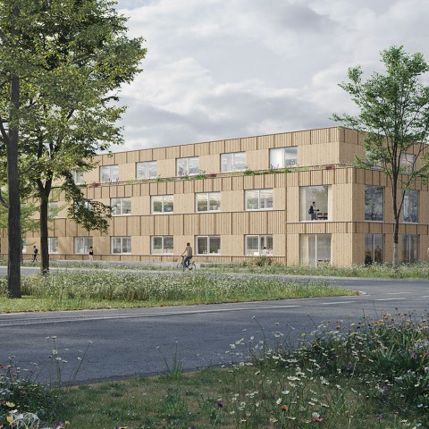 From this concrete structure, they provide new insulation and facade finishing. B-architecten is working with sustainable wooden prefab elements in which, among other things, the insulation is already incorporated. These will be finished with wooden boards and the exterior joinery will also be made entirely out of wood, just like a large part of the extensions: the new refectory pavilion will consist entirely of a wood structure in CLT, with another wooden facade finish. The connection between the new head office and the refectory pavilion will be made out of wood as well.