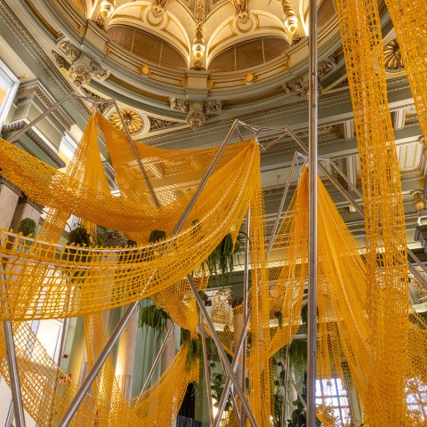 Siestódromo. To reclaim calm, rest, slowness, and the right to laziness, this small garden has been joined by an installation that reflects on the intention of STOP, with a set of sleeping places and rest devices dubbed the siestódromo: hammocks for reading, relaxing, or taking a leisurely nap. The space opened on Thursday, July 10th, with a reading of Georges Perec's Life: A User's Manual, alongside the Pérgamo bookstore, and an electronic music session by Massi Cassu, which proposes a deep-listening sound nap.
