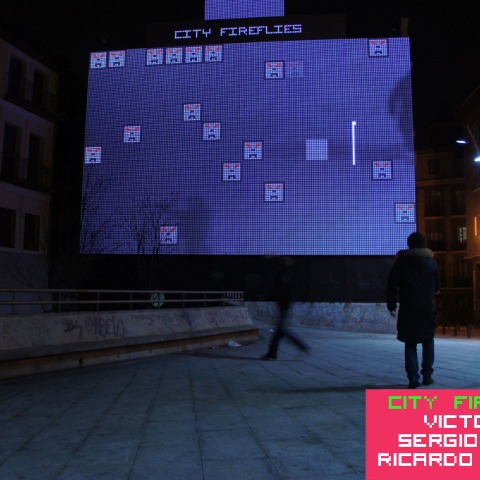 In order to play City Fireflies you only need a cellphone with a light screen- almost any phone- or any other source of portable light such as a small lantern. Players should aim their light to the screen, in which they are also reflected. In order to eliminate the invaders, the light source needs to coincide with each creature´s position. This results on players running around the square. City Fireflies has three levels of difficulty. The first begins when the first invader is eliminated. In order to move to another level, the screen needs to be completely invader-free before time out. When the third level is finished, the game is over and restarts. It is possible to play individually, but more simultaneous players are needed in order to move to the second level. With more players it is easier to eliminate the enemies.