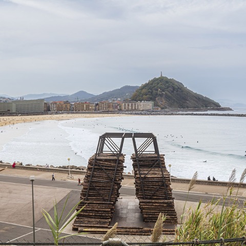 The construction of the pavilion aims to transfer the problems generated by forest fires to urban environments and draw attention to this problem head-on. The proposal is inspired by the morphology of Mount Urgull, a sculptural symbol, and lung of the city, to confront it by rising as an iconic structure composed of burned tree trunks.